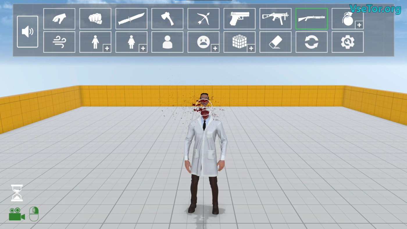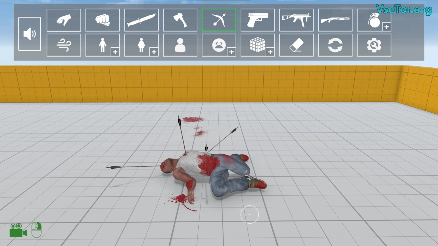 На выбор — целый арсенал: от ножей и пистолетов до взрывчатки, которая превращает сцену в хаос из летающих тел. Можно сталкивать противников лбами, строить ловушки или просто наблюдать, как они колошматят друг друга в спонтанных драках. А если надоест быть зрителем, возьми управление любым персонажем и сам реши, кому сегодня не повезёт. Механика простая, но каждый раз получается новый абсурдный сюжет — то неудачный побег, то эпичный удар ногой с разворота.