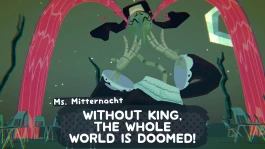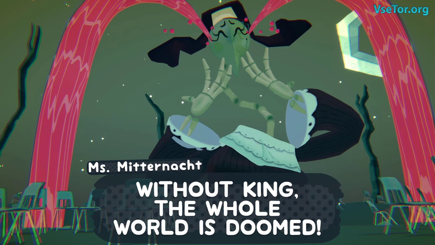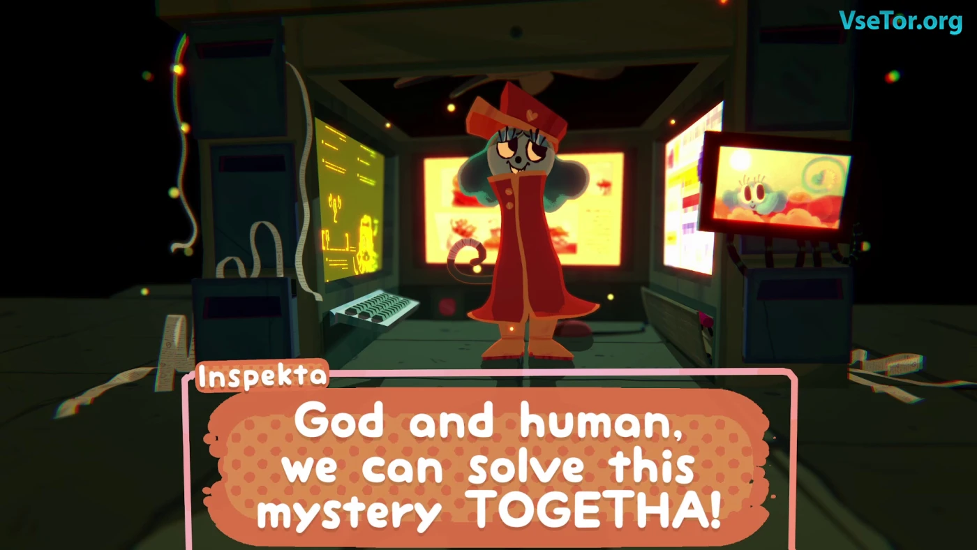 Мир раскрывается через яркие, почти кукольные декорации: 2D-локации с бумажной текстурой переходят в объёмные диорамы при встрече с богами, а между делом вас ждут VHS-ролики с живыми куклами – безумные, трогательные и слегка жутковатые. Каждый уголок острова пропитан характером его божеств: дождь – это слёзы Мс. Миттернахт, а бизнес-обезьянки в пиджаках рьяно служат богу лидерства. Персонажи запоминаются не только визуалом, но и лексикой – с нарочитыми опечатками, сленгом и игривой пунктуацией, будто писали их весёлые подростки с чувством стиля.