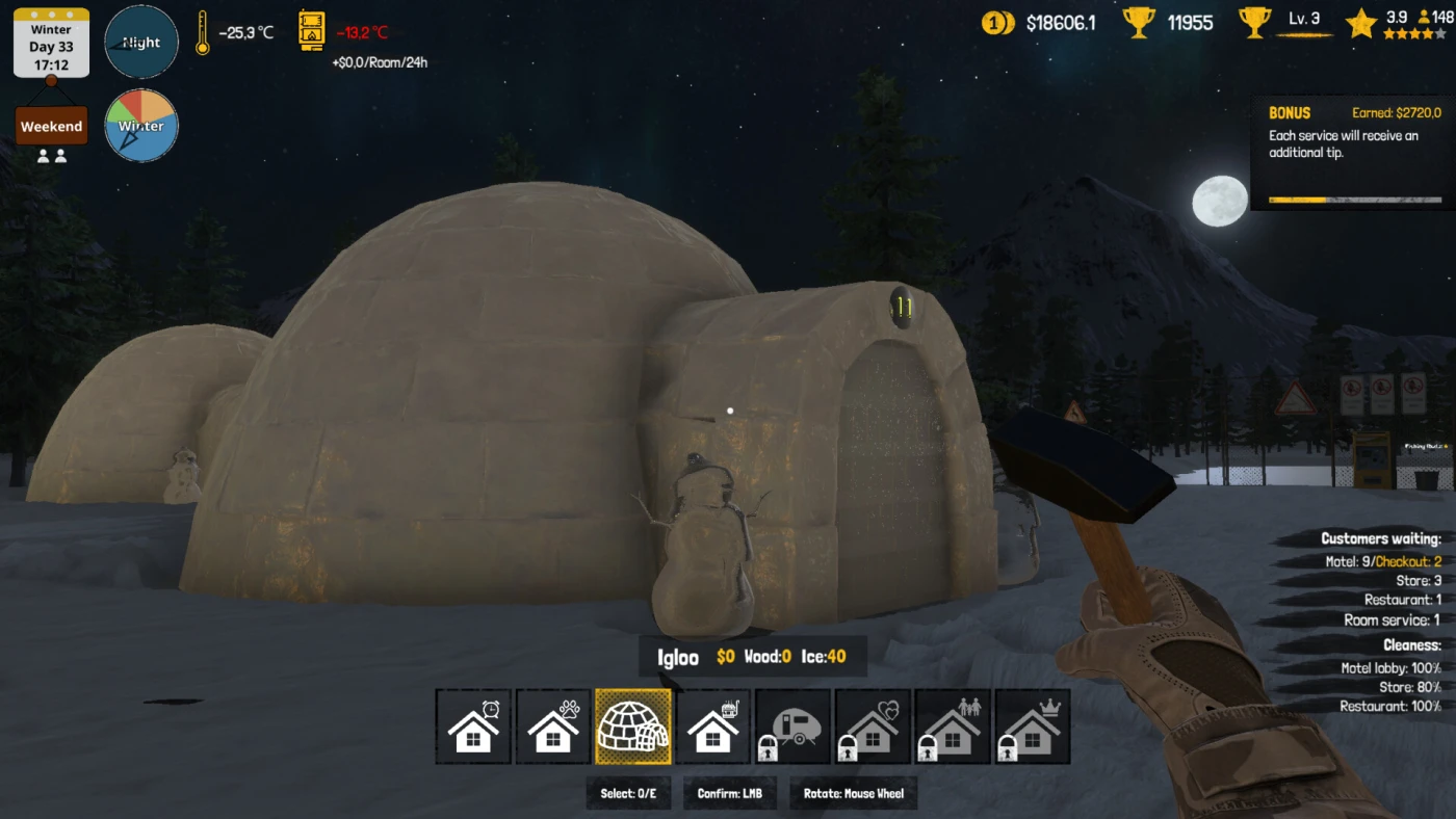 Arctic Motel Simulator — вы оказываетесь в холодной и дикой Арктике, получив в наследство старый мотель, который надо вытащить из запустения. Вы начинаете с простого: чистите номера, ставите кровати, зовёте первых гостей, чтобы заработать хоть что-то. Тут всё по-настоящему: летом солнце не заходит, зимой — одна сплошная ночь, а погода то и дело проверяет вас на прочность — метели, морозы, северное сияние над головой. Выбираете, какие комнаты сдавать — от обычных до зимних иглу, — и следите, чтобы людям было тепло и уютно. Звуки ветра и шаги по снегу прямо в уши лезут, будто вы там стоите.
