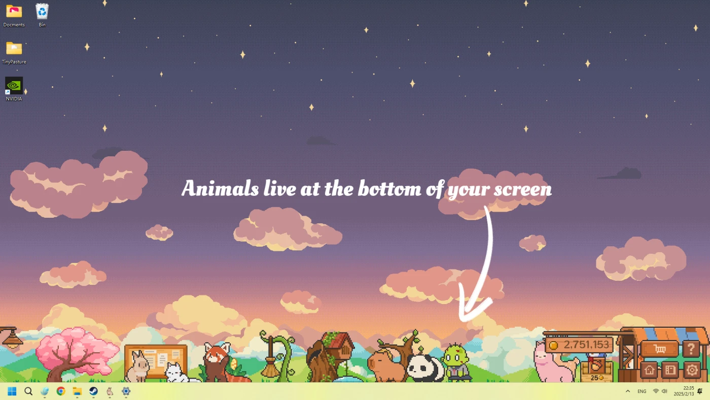 Tiny Pasture — симулятор питомцев и идеальный компаньон для тех, кто хочет совместить работу с заботой о виртуальных зверушках. Представьте: внизу экрана, пока вы трудитесь над отчетом или смотрите сериал, резвятся пушистые хомячки, ленивые капибары и даже призраки, которые почему-то обожают чернику. Вам не нужно постоянно отвлекаться — достаточно изредка подкидывать еду, убирать «сюрпризы» волшебной метлой и наблюдать, как ваш мини-зоопарк растет и приносит монетки.