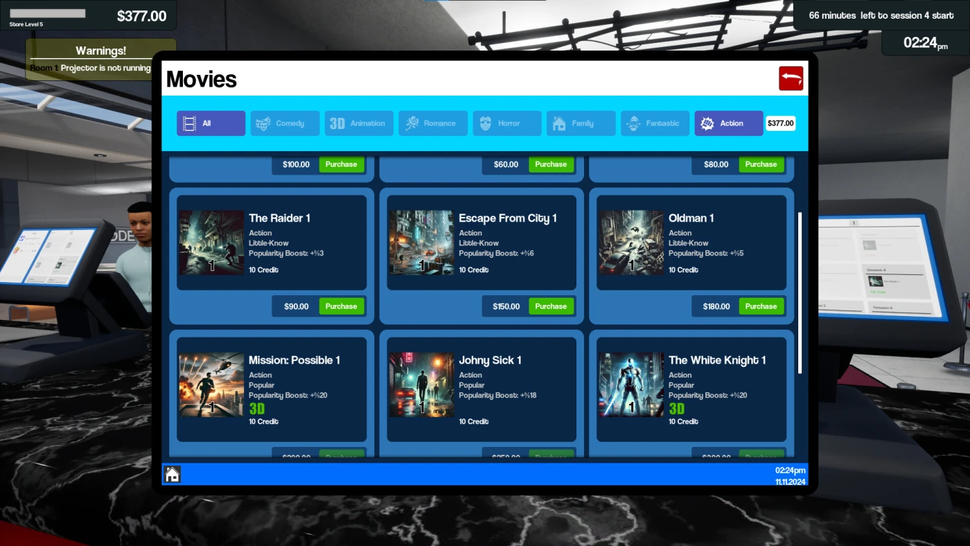 Cinemaster Cinema Simulator переносит вас в уютный мир кинотеатрального бизнеса, где каждый день наполнен яркими событиями и приятными хлопотами. С самого начала вам предстоит выбрать название для своего кинотеатра, составить расписание сеансов и подобрать фильмы из обширной коллекции — от пародийных блокбастеров до кассовых хитов. Особый шарм игре придают забавные отсылки к популярной культуре: например, вы можете показывать фильмы вроде «Пираты Карибского моря: Сундук мертвеца... с сюрпризом».