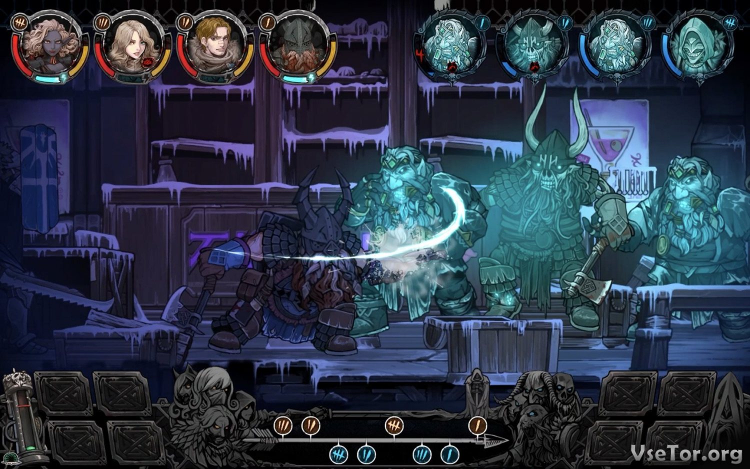 Вы же в составе отряда главной героини сможете тоже отправиться в битву. Но прежде вам нужно будет освоить море механик и хитростей, на которых базируется игровой процесс. Во-первых, вам нужно будет собрать отряд героев и прокачать каждого из них. Во-вторых, в Vambrace: Cold Soul вам нужно будет освоить механику пошаговых сражений, в которых каждый ваш ход будет оказывать влияние на исход боя. Ну а в-третьих, вам еще многому предстоит научиться в плане способностей и навыков.