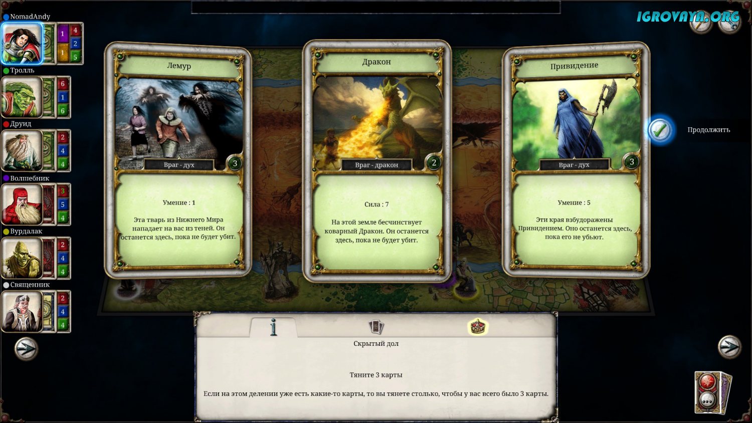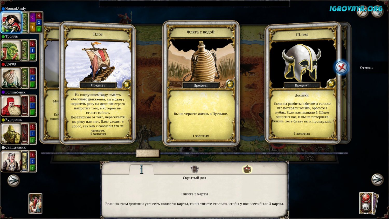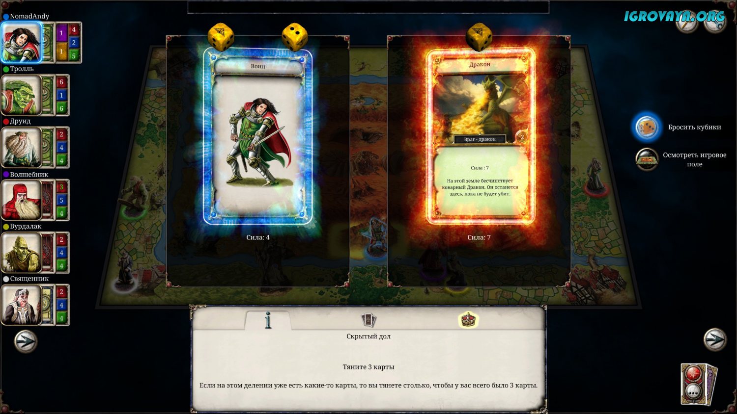 Игровой процесс здесь и вовсе уникален по всем направлениям. Но самое главное заключается в рандоме, который присутствует тут буквально во всем без исключения. Взять даже стандартные ходы: сначала вы должны будете бросить кубик, чтоб получить то или иное количество ходов, потом делаете ход и начинает происходит какое-нибудь рандомное событие. При этом сами события выпадают рандомно, и последствия этих событий тоже рандомны. Где-то на вас могут напасть, где-то вы попадете на ярмарку, а где-то и вовсе можно встретить колдуна. Вариантов много…