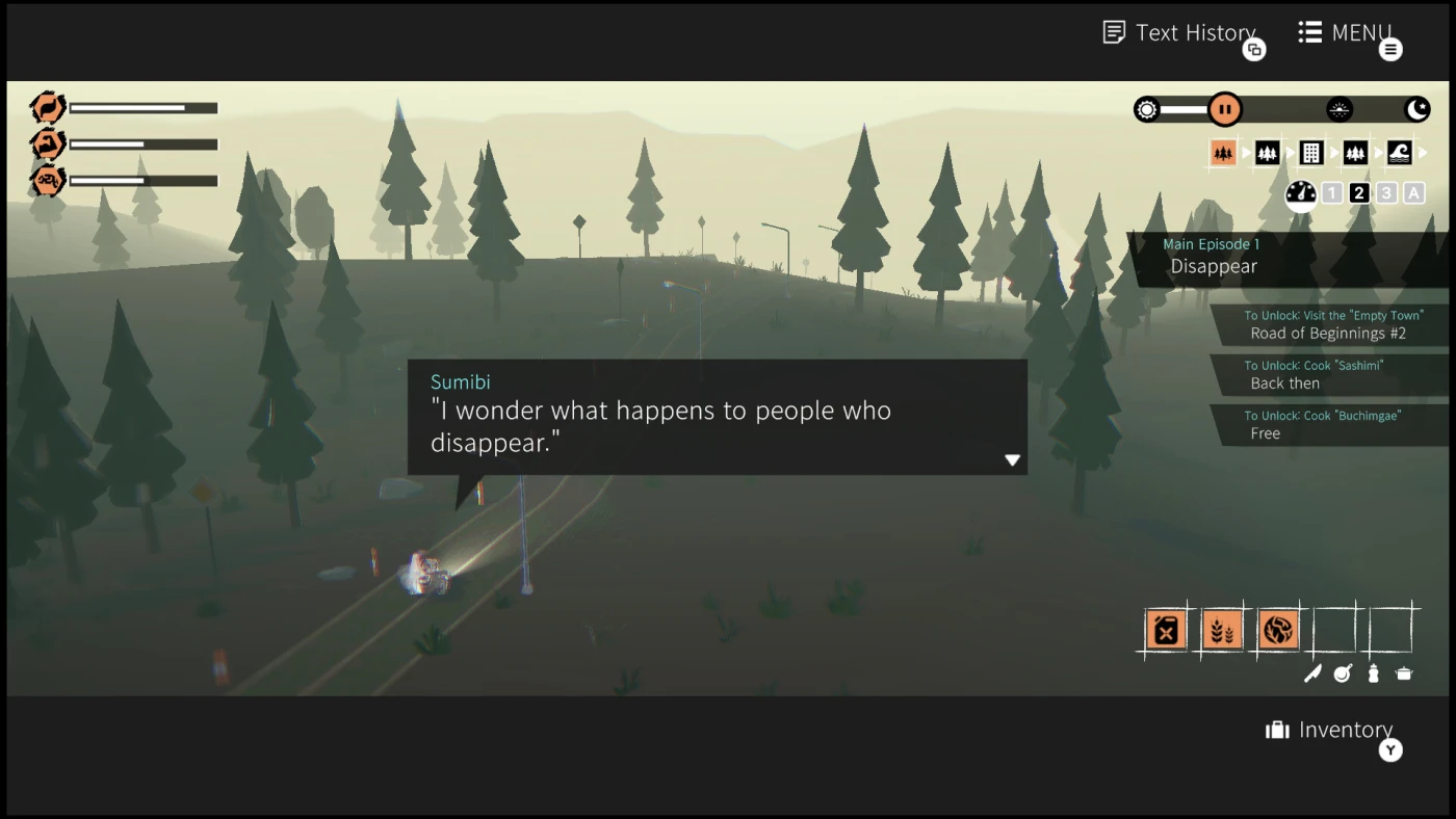 Геймплей здесь — медитативное движение вперёд. Диалоги разматываются вместе с километрами дороги: остановитесь — и слова замрут. Ночью нужно искать заброшенный дом для ночлега, днём — рыться в руинах в поисках ингредиентов. Приготовленный обушь может открыть новые темы для разговоров, а может и напомнить о вещах, которые лучше не трогать. Механики просты, но в них есть горькая поэзия: даже кофеварка в рюкзаке Никоми становится символом — пока девушки готовят еду и смотрят друг на друга, они существуют.