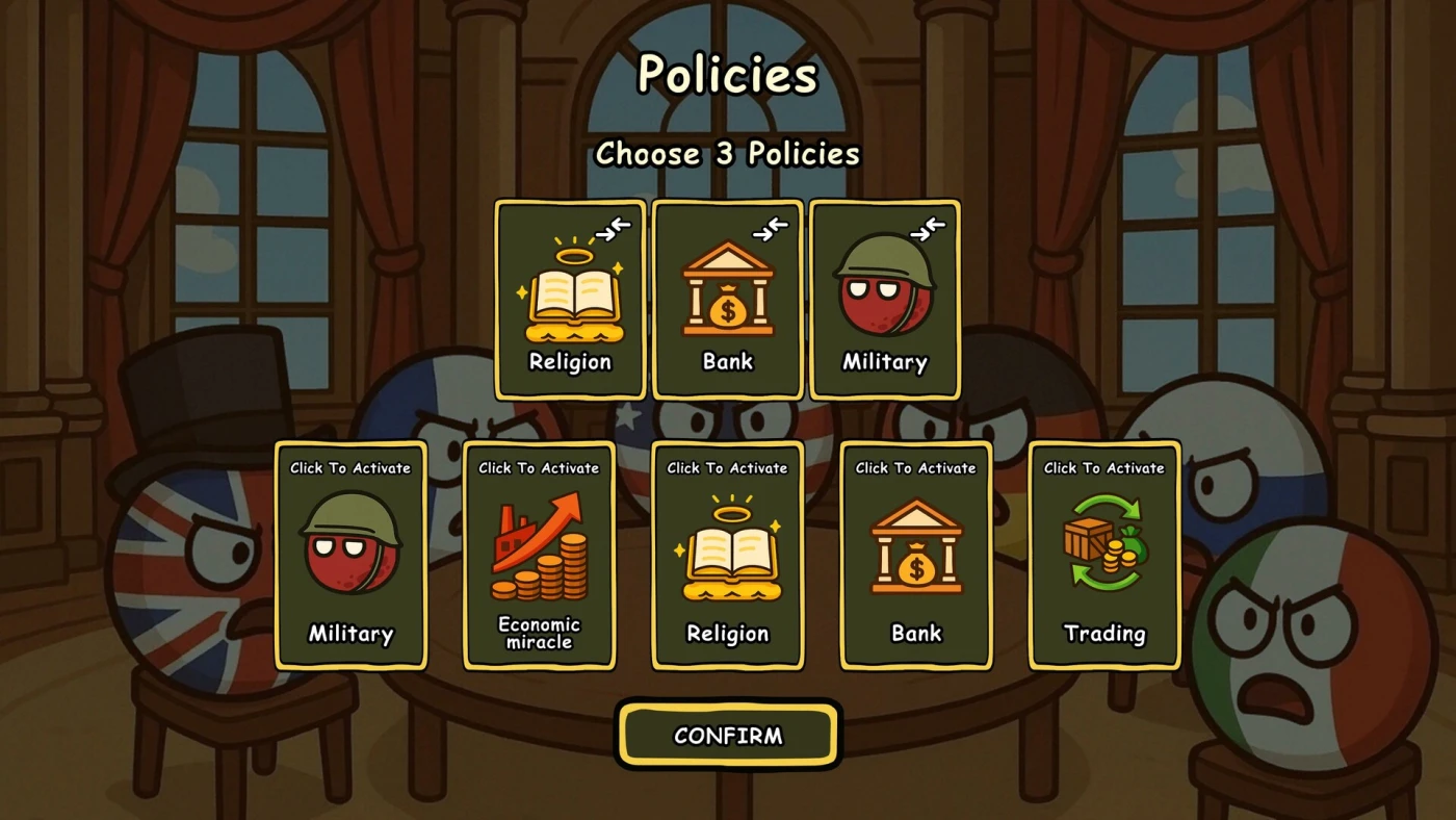 Countryballs: Power Protocol — стратегия, где мир — это шар, а вы — его главный перекрашиватель. Возьмите под контроль один из 195 Countryballs и решите: катить его к победе на танках, дипломатических переговорах или волне религиозного влияния. Здесь нет полумер: либо ваша сфера станет единственной на глобусе, либо вас сотрут в политический порошок. И да, экономика работает даже когда вы спите — доход капает каждую секунду, так что выбирайте: вкладываться в заводы или сразу в ядерные боеголовки.