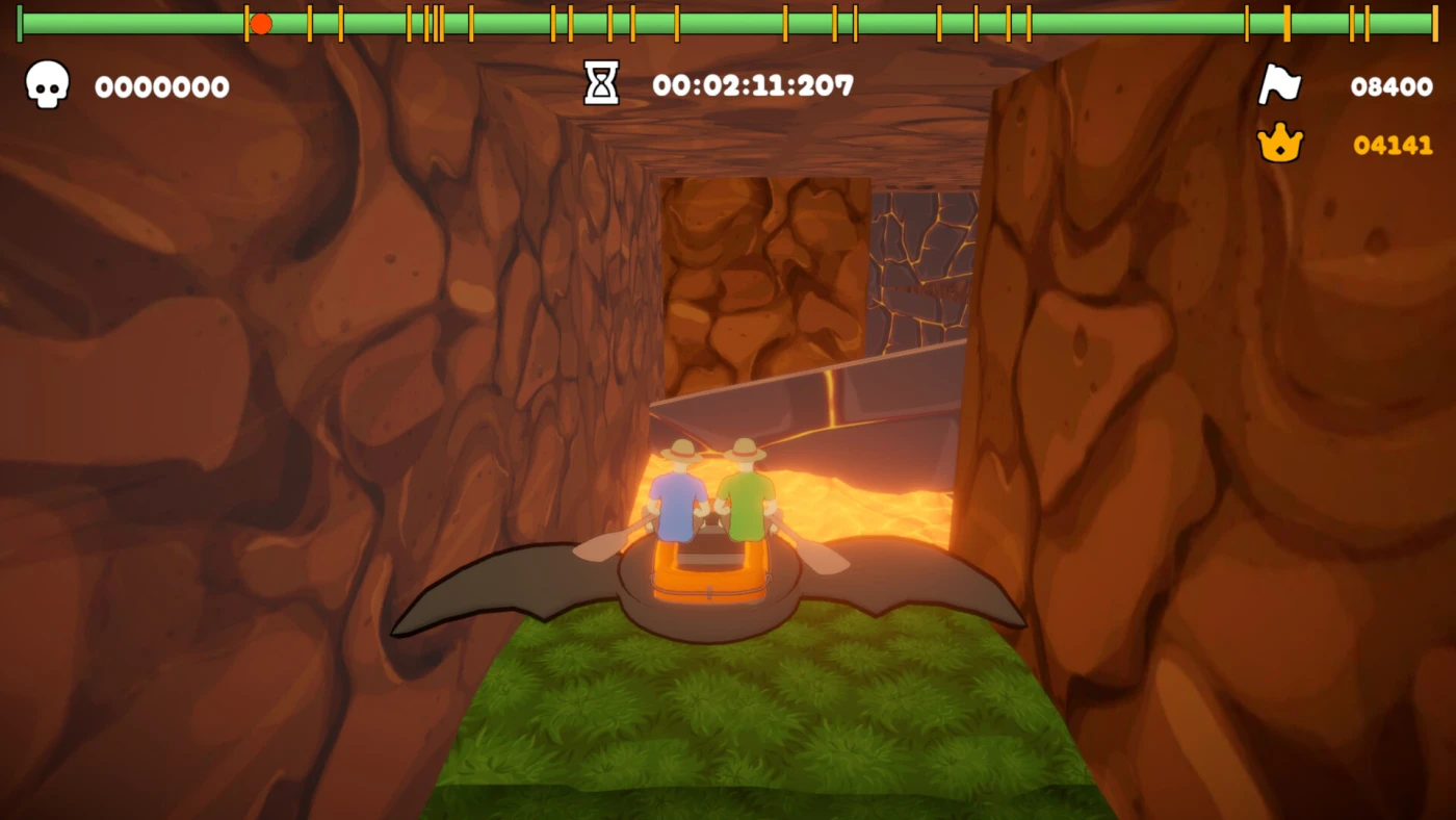 Ловушки здесь словно сошли со страниц дьявольского комикса: машущие топоры, коварные прыжки (один конкретный — на 27 попыток, это не шутка), порывы ветра, которые опрокидывают лодку в лаву с издевательской грацией. Физика весёл — отдельный вид искусства: они болтаются, путаются и норовят перевернуть вас в самый неподходящий момент. Но в этом и кайф: каждое микроскопическое продвижение вперёд ощущается как победа над вселенной, которая явно против вас.