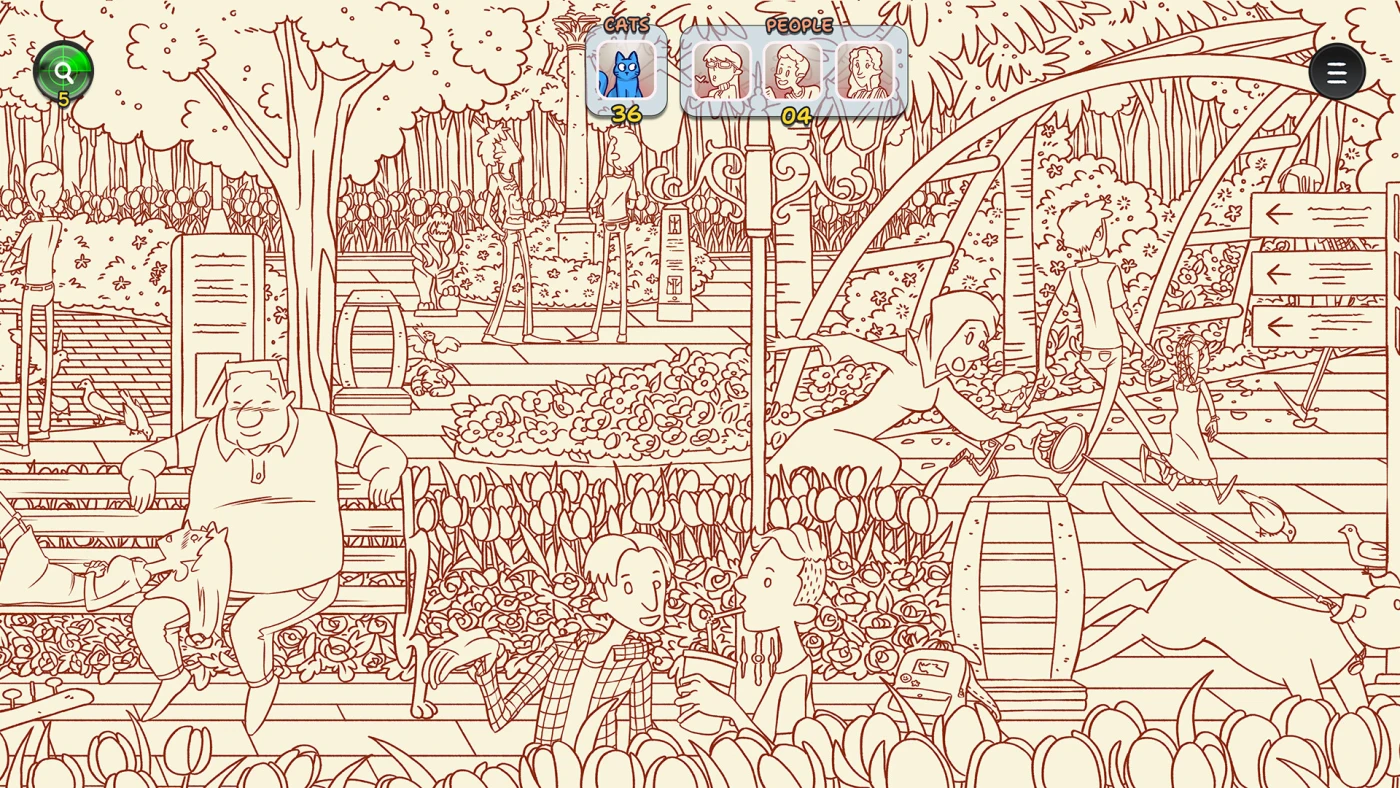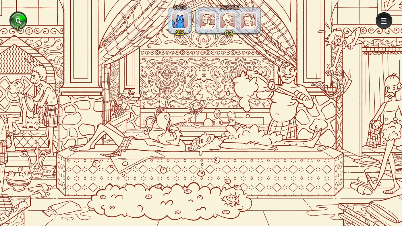 В главной панораме – 200 котов, и среди них особенные: 12 уникальных мурлык, за которых открываются бонусные уровни. Это уже отдельные сцены – хаммам, кальянная, лавка с конфетами, Гюльхане-парк, Гранд-базар, синяя мечеть и даже фестиваль в Балате. Там котят ещё больше: от 50 до 100 на локации. А в финале — «всё включено»: 150 котов и 100 человек, разбросанных по одной огромной сцене. Кто-то прячется за вазой, кто-то – под зонтом, кто-то просто прикинулся пакетом. Помогает радар, но настоящий кайф – в поиске без подсказок.