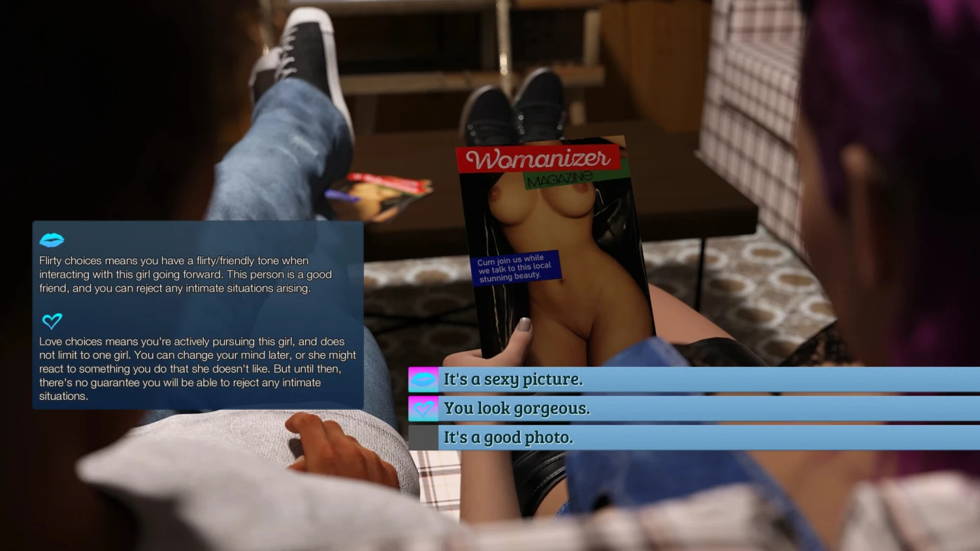 Вы знакомитесь с разными девушками – у каждой своя история, свои тайны и травмы. У вас есть выбор: строить роман, флиртовать, стать друзьями с бонусами или вообще держаться в стороне. Поведение главного героя влияет на развитие событий: можно выбрать один путь или перепробовать все. В игре реализованы два режима – визуальная новелла и свободное перемещение, где вы бродите по локациям, собираете предметы и получаете доступ к контенту через встроенный телефон.
