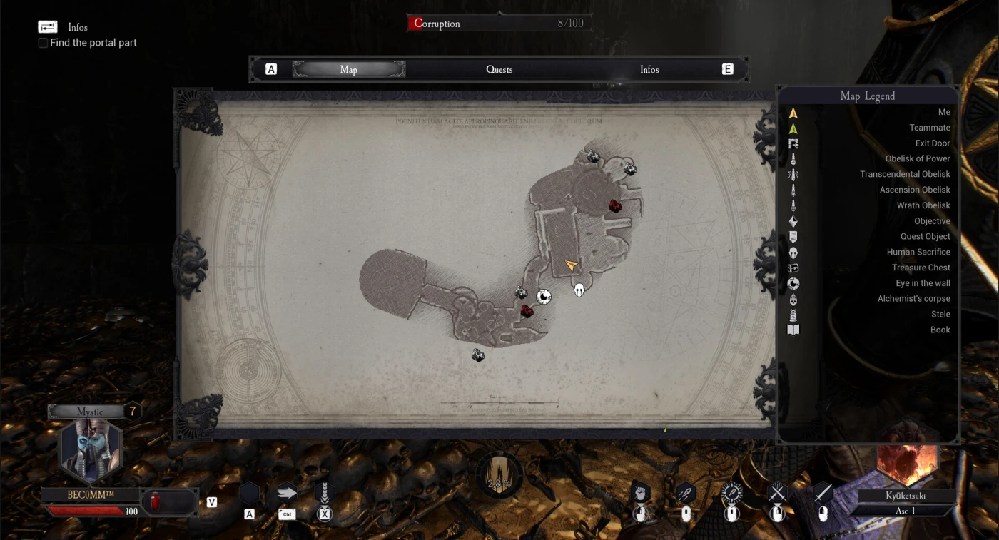 Бой здесь – это плоть, сталь и адская энергия. Вы управляете оружием, одержимым живым Даймоном – демонической сущностью со случайно генерируемыми способностями, как полезными, так и опасными. Меч, топор, катана – каждое оружие уникально, а его сила растёт в ходе экспедиции: вы «возносите» клинок, получая бонусы и новые навыки. В бою вы рубите, рветесь вперёд рывком, используете заряжаемые дальние атаки и мощные финальные удары. Есть блок, парирование, двойной прыжок и алхимические способности, которые можно прокачивать. Но будьте осторожны – чем больше вы убиваете, тем выше уровень Коррупции. Достигнув 100%, вы окончательно погибаете.