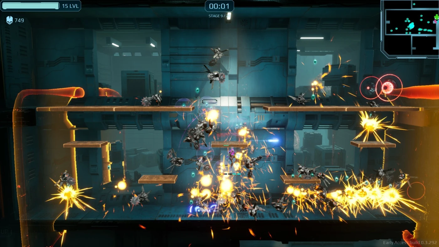 Вы выбираете одного из персонажей – каждый со своим уникальным оружием и стилем боя – и развиваетесь прямо в бою: за опыт получаете навыки, а оружие эволюционирует до сверхмощных форм. Система напоминает Vampire Survivors, но с важным отличием: атака идёт автоматически, а всё остальное – прыжки, рывки, сбор бонусов – требует полного контроля. Исчезающие платформы, мини-боссы, агрессивные толпы мобов и необходимость буквально «пробегать» уровень за 30–60 секунд создают ощущение постоянного адреналинового пика.