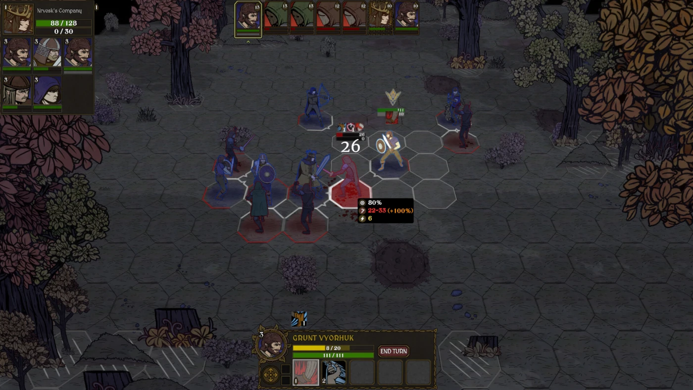 Бои разворачиваются на 8-направленной сетке, где позиционирование решает всё: фланги и тылы обходятся дороже, чем здоровье. Броня защищает от урона, но не от хитростей врагов – они координируются, заманивают в засады и целенаправленно атакуют короля. Если Нрвеск падает, игра заканчивается. Перманентные травмы, нехватка медикаментов и голод делают каждое сражение вопросом выживания, а не славы.