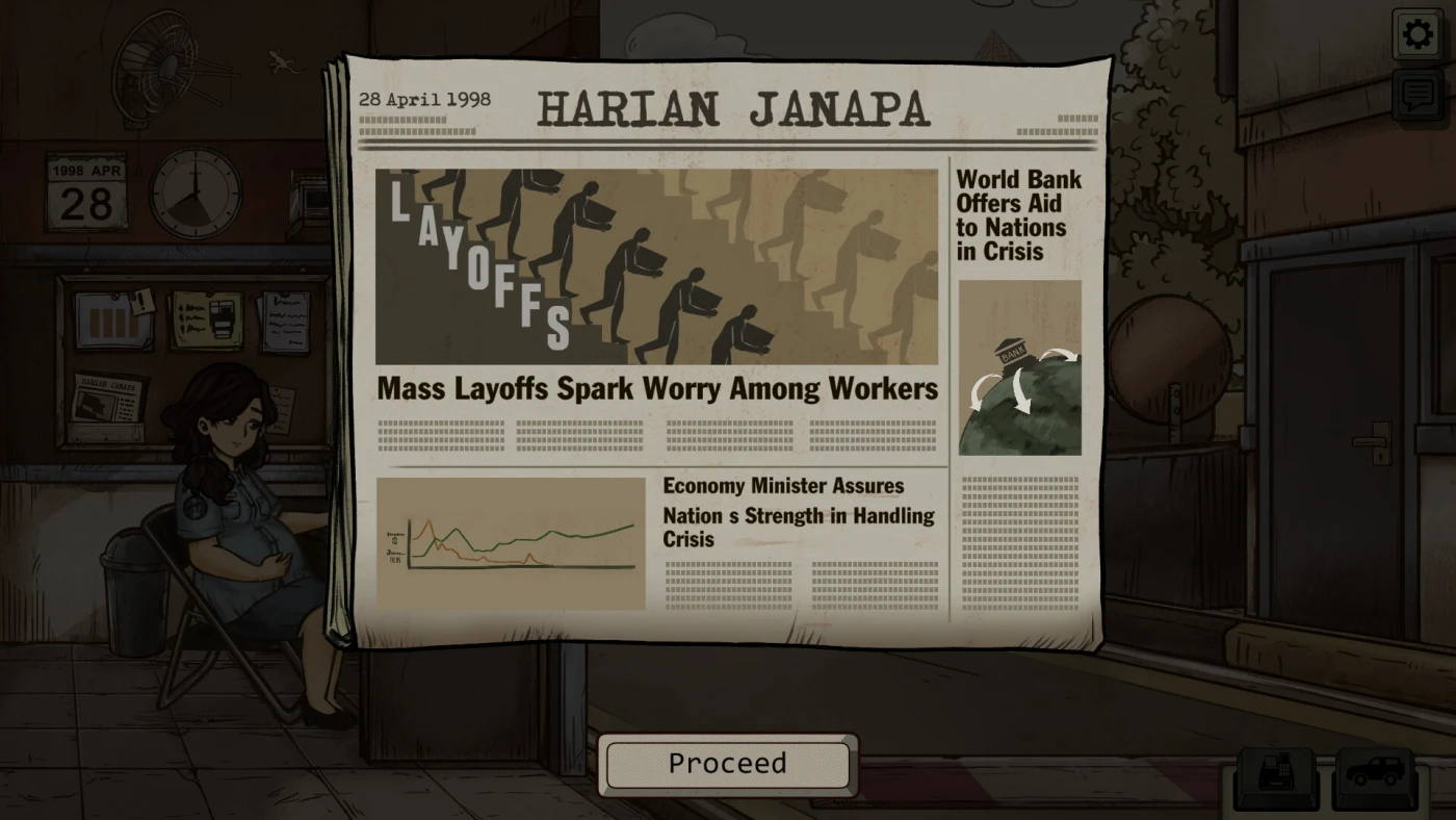 1998: The Toll Keeper Story – нарративный симулятор, где вы в роли Деви, беременной женщины и сборщицы пошлин в вымышленной стране Джанапа, ежедневно решаете, кого пропустить через шлагбаум, а кого – оштрафовать или даже арестовать. На фоне экономического кризиса и нарастающих протестов каждое ваше решение имеет последствия: слишком мягкий подход лишит вас денег на еду и аренду, а чрезмерное усердие может разрушить связи с мужем-таксистом или подругой из элиты.
