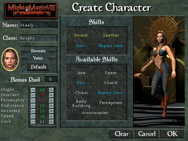 Самое же интересное коснулось настройки персонажа. Теперь вы не будете выбрать по схеме класс-раса, и сможете выбрать лишь класс персонажа. Всего же в вашем арспоряжении будет 8 классов, среди которых рыцарь, вампир, темный эльф, минотавр, дракон, некромант, тролль, и клерик. У каждого класса в Might and Magic 8: Day of the Destroyer, естественно, свои силы, возможности, способности и навыки, и каждый персонаж обладает уникальными характеристиками. Один может изначально иметь повышенный уровень интеллекта и лидерства, а другой будет более мощным.