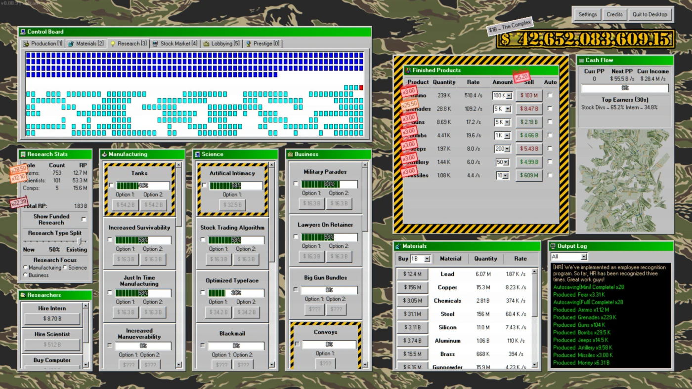 Military Incremental Complex – ироничный кликер с привкусом девяностых, где вы не просто жмёте кнопки, а строите собственную империю военно-промышленного комплекса от ручной сборки патронов до ядерных боеголовок. Стилизованный под Dope Wars ’98 интерфейс встречает вас пиксельными менюшками и ностальгическим шармом, но за этой простотой скрывается многослойная система: 11 видов оружия производятся по-разному, а каждое новое изделие требует не только ресурсов, но и тонких решений – когда автоматизировать, когда расширять добычу, а когда подогреть спрос через лоббирование.