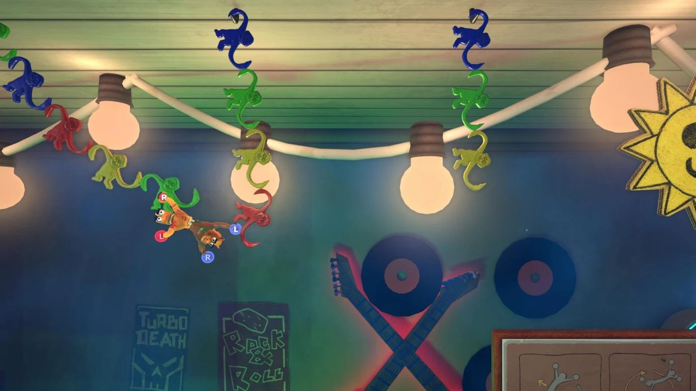 Дом разделён на шесть комнат – от заваленной хламом спальни до кухни с лезвиями и электрическими ловушками. Повсюду – ретро-атмосфера 90-х: VHS-кассеты, плюшевые монстры и гигантская рука, которая то и дело вмешивается, чтобы сбросить вас с высоты прямо на «точку возрождения». Падения часты, а иногда и смешны – особенно когда один удачно лезет, а второй случайно его сбрасывает. Но именно в этих моментах рождается либо дружба на годы, либо взаимные упрёки и шутки про «развестись».
