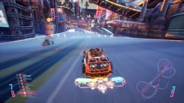Гонки построены по знакомой схеме: сначала ускоряйтесь и уворачивайтесь, потом включайте огнестрельную фазу, когда все начинают мочить друг друга без разбора. Удачный дрифт даёт прирост скорости, но управление часто подводит – машины скользят, как по льду, а при столкновении с ограждением отскакивают, будто в пинболе. Оружие у большинства авто слабовато, кроме одного дисбалансного лазера, который сносит врагов за секунду. Зато трассы впечатляют: тоннели, развилки, футуристическая подсветка – всё создано с любовью к жанру.