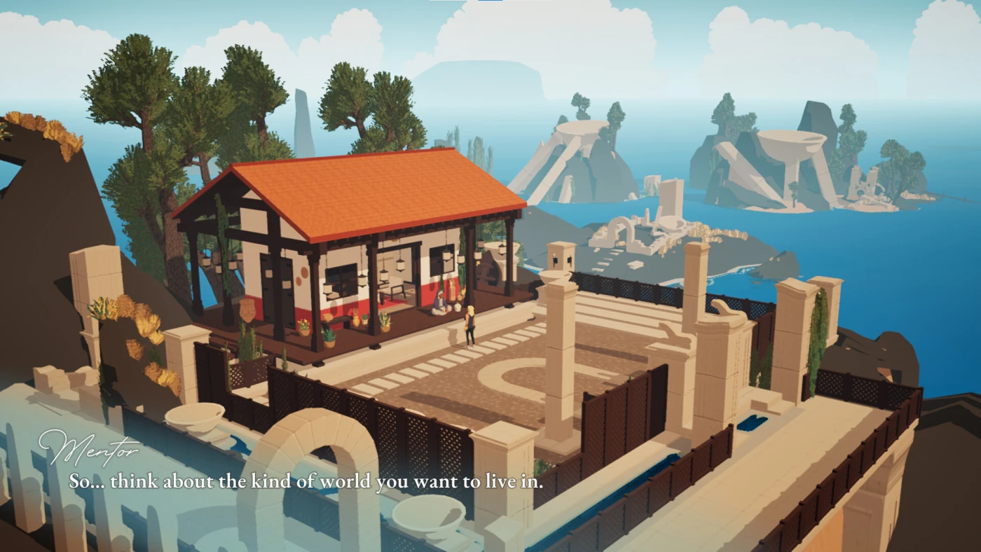 Всё действие разворачивается на одной террасе с видом на океан. Никаких карт, диалогов или UI-подсказок – даже прицел приходится угадывать по движению руки. Именно эта простота делает каждое решение ощутимым, почти физическим. А ментор, сидящий в углу с чашкой чая, лишь мягко напоминает: вы не можете контролировать последствия, но обязаны принять решение.
