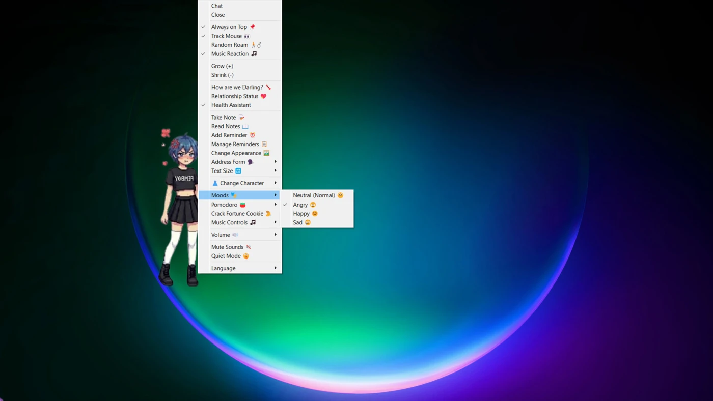 Она следит не только за вами, но и за вашим ПК. Перегревается процессор? Она забеспокоится. Сидите слишком долго? Напомнит: «Встань, попей воды, а то ноги онемеют!» Есть встроенная записная книжка – скажите «Запомни это», и она сохранит. Ещё здесь есть таймер для работы по методу Помодоро, предсказания на день и даже музыкальные реакции. Всё это – не ради геймплея, а ради ощущения, что кто-то рядом.