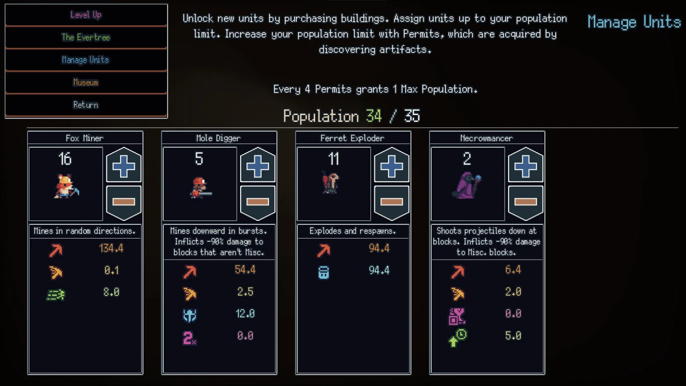 Со временем вы нанимаете новых помощников – кротов, мышей с динамитом, лис с кирками, у каждого своя задача и стиль. Чем глубже, тем мощнее инструменты: буры, улучшения, скилы. Находите более чем 150 артефактов, и они привлекут новых союзников, расширяя армию. Система прокачки гибкая: можно строить разные «сборки», экспериментировать с деревьями навыков, сохранять и сбрасывать их – свобода есть даже в мелочах. И да, будьте осторожны: слишком много юнитов могут подтормаживать, но это мелкая плата за такой масштаб.
