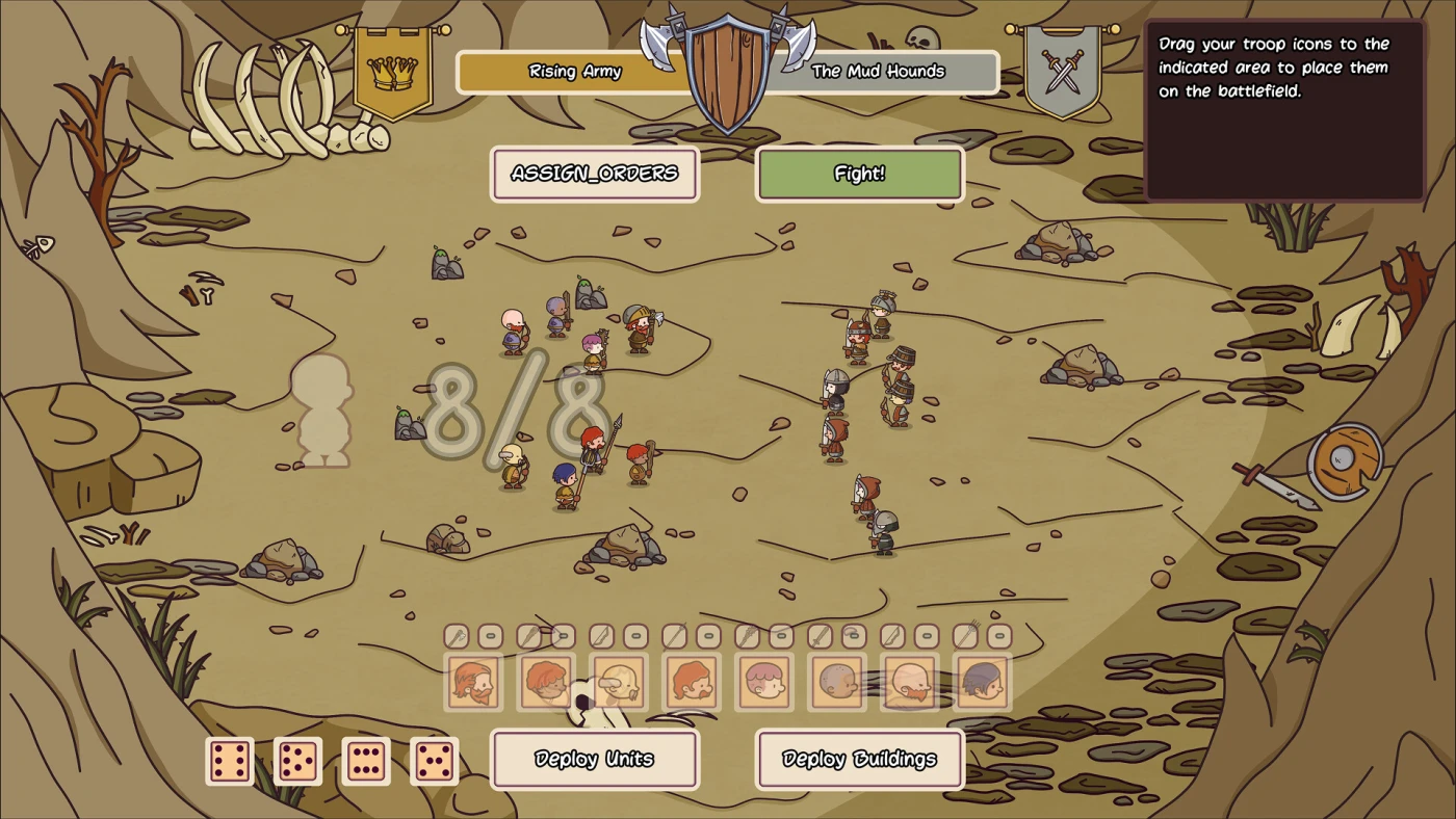 Управляйте лагерем как живым организмом: стройте новые здания, повышайте боевой дух, лечите раненых, кормите людей и готовьте их к следующему заданию. Король ждёт выполнения приказов, но ресурсы ограничены, а время идёт. Иногда придётся идти в бой усталыми, голодными или без половины отряда. Каждое решение между сражениями влияет на исход следующей битвы — и на то, кого вы больше никогда не увидите.