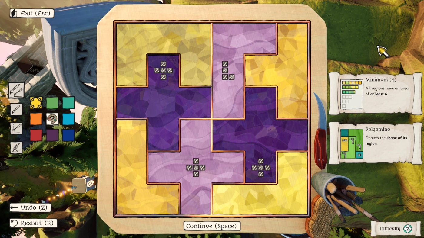 Пазлы – сеточные, чисто логические, без случайностей: разделяете поле на участки, следуя более 20 разным правилам, которые вводятся постепенно и комбинируются. Можно раскрашивать стекло вручную или обводить границы – участки заливаются автоматически красивыми цветами. Всё интуитивно: игра сразу подсказывает, почему ход неверный, есть заметки, ведёрко для заливки, подсказки без штрафов. Прогресс нелинейный – решайте сколько угодно, чтобы заполнить витраж-прогресс, и возвращайтесь к сложным позже, когда мозг «прокачался». Уровни от 1 до 7 по сложности, с опциональными финальными вызовами для мастеров.
