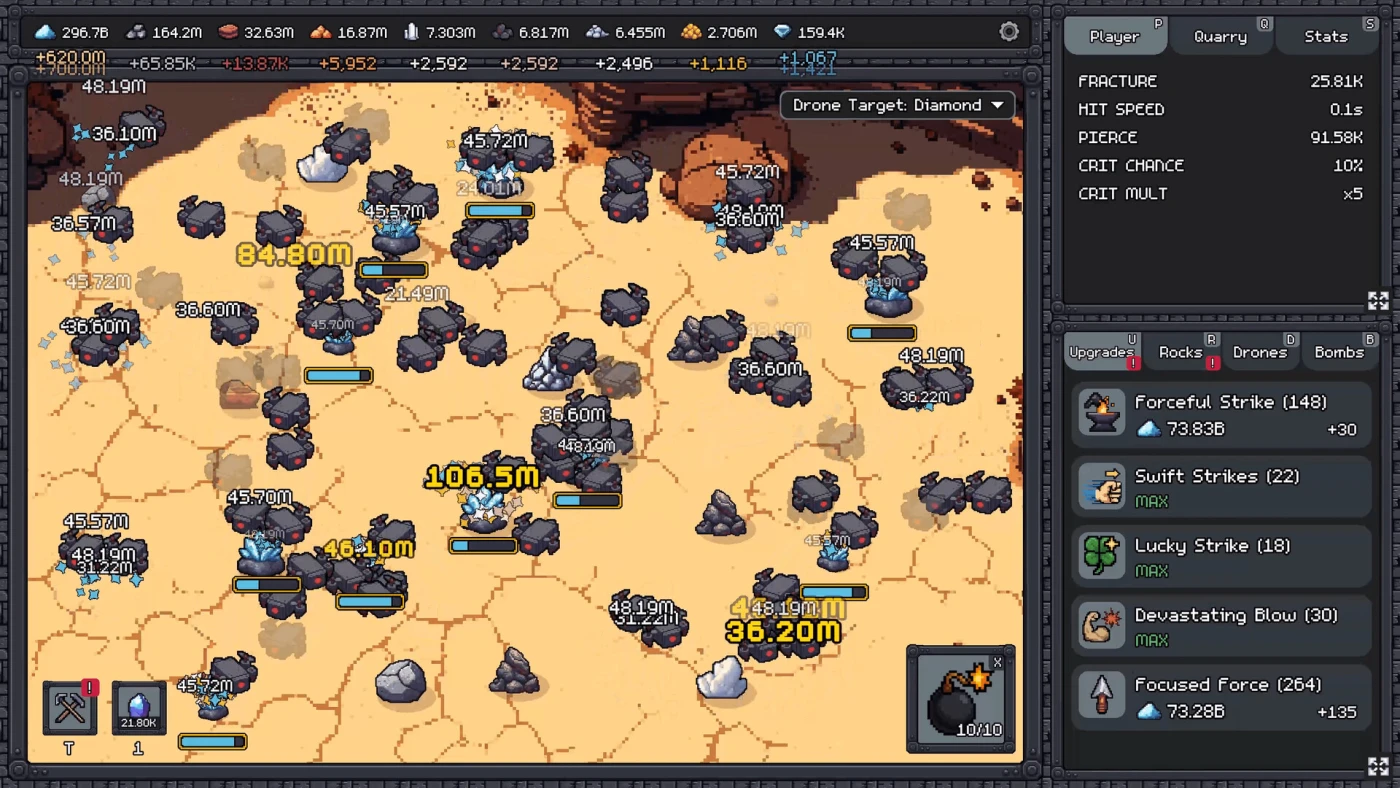 Fracture Field — это инкрементальная игра про добычу ресурсов в карьере. Вы начинаете с простого камня и ритмичных ударов мышкой. Каждый удар приносит ресурсы, а потом вы вкладываете их в улучшения. Со временем появляются новые слои породы — глина, песчаник, более твёрдые материалы и ценные жилы. Нужно не просто кликать, а думать, как лучше расчищать пространство, когда использовать заряжаемые бомбы и как эффективнее работать.
