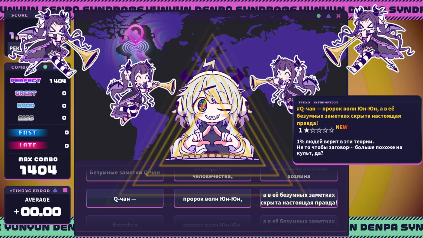 Yunyun Syndrome!? Rhythm Psychosis — это ритм-игра, которая с головой окунает вас в мир денпа-культуры. Вы играете за Qtie, обычную школьницу-дропаут, которая превратилась в хиккикомори и живёт в заваленной мерчем комнате. Её дни проходят за энергетиками, бесконечным сидением в интернете и шизопостингом про любимую аниме-девочку Юнюн. А потом прямо из монитора появляется сама Юнюн и даёт странное задание: нужно генерировать «докидоки» для её «кокоро», смешивая любовь к персонажу и безумные теории заговора. Игра яркая, агрессивная, с кучей несочетаемых цветов и энергии, от которой иногда реально мозг начинает плавиться.