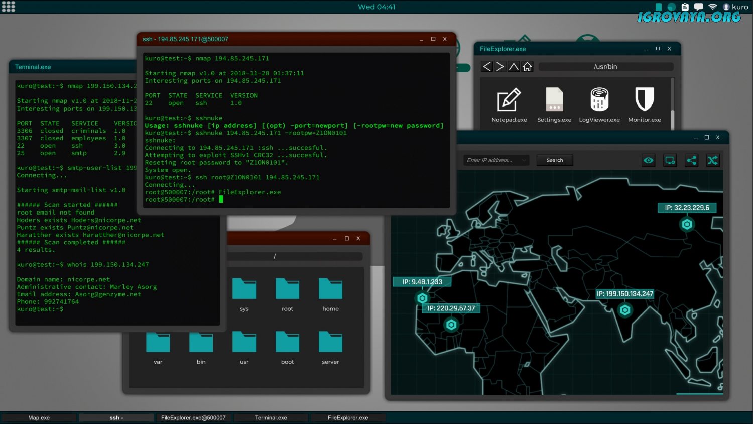 Одной же из ключевых особенностей этой игры является то, что вы сможете кооперироваться с другими пользователями и вместе осуществлять различные взломы. Но учтите тот факт, что каждое ваше действие, каждый ваш взлом, каждое выполненное вами задание будет иметь последствия. Более того, после вашего выхода из игры жизнь в этом мире не останавливается, как и в реальности – даже без вас смогут происходить самые разные события. Развивайтесь, выполняйте задания в режиме многопользовательской или одиночной игры, открывайте новые утилиты и программы и влияйте на мир, совершая взломы. Другими словами, веселитесь… У нас вы можете скачать Grey Hack торрент последнюю версию бесплатно на компьютер.