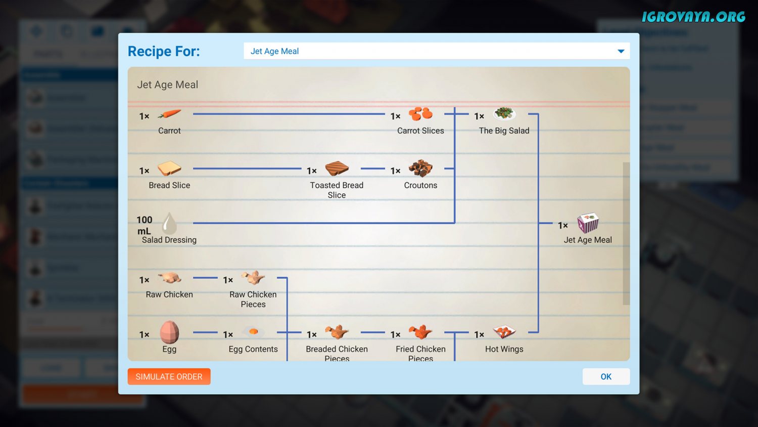 Выглядит же все достаточно просто. Взять, к примеру, изготовление гамбургеров. Сначала вам придется ознакомиться со схемой изготовления и перечнем продуктов, которые потребуются – сыр, котлета, булка. Ну а дальше нужно будет сделать так, чтоб бургер изготавливался автоматически, самостоятельно. Для этого нужно будет поставить прибор, на котором будут заготавливаться булки и сырые котлеты, потом прибор, на котором будет жариться котлета, потом робота, что будет укладывать котлету и сыр в булку, и затем прибор для подачи блюда. Причем, все эти процессы вам нужно будет объединить в один цельный процесс.