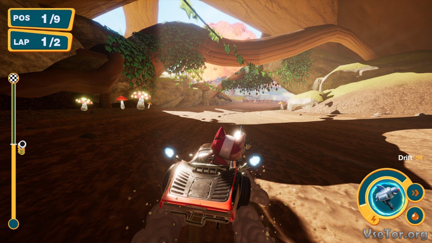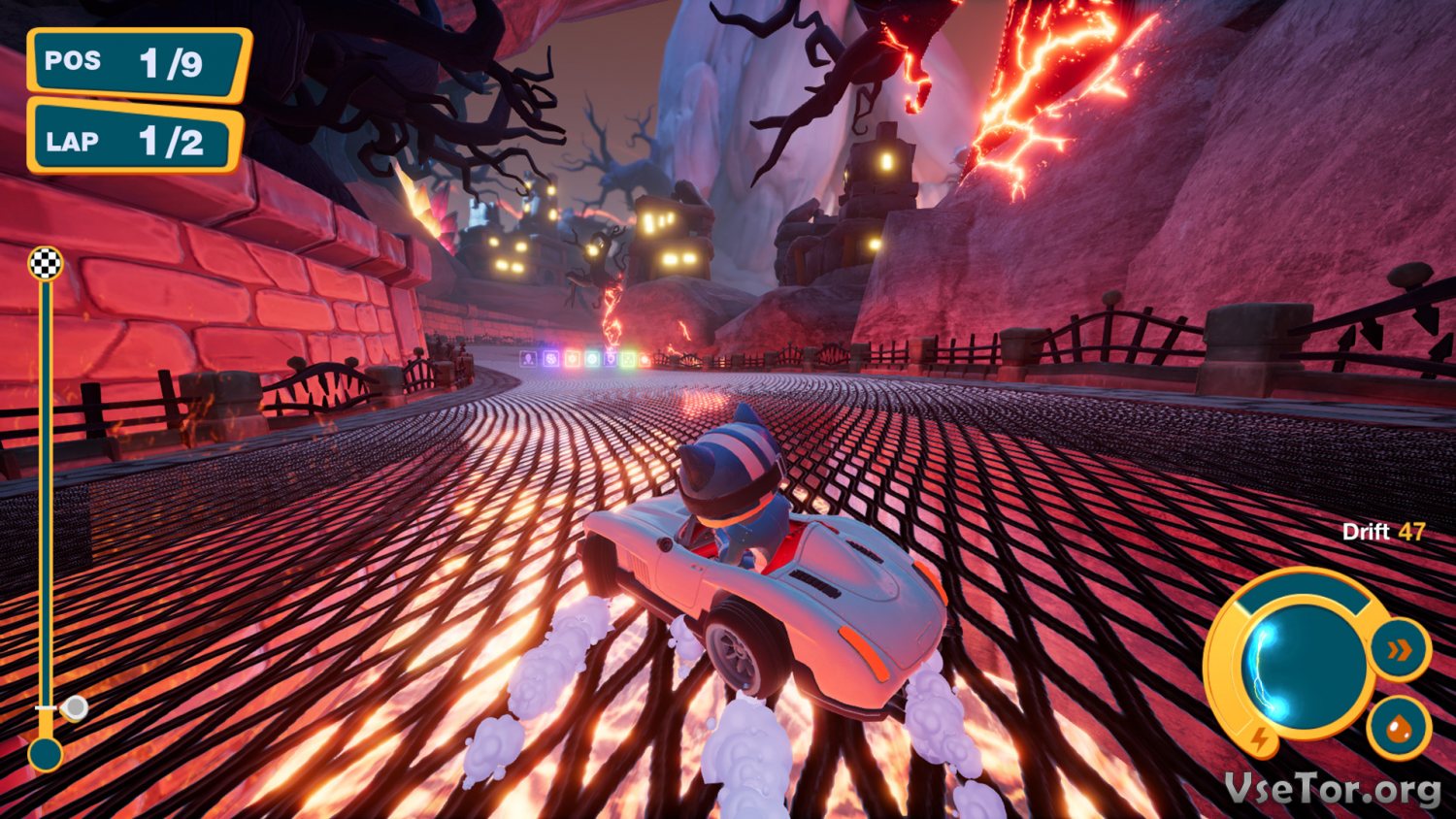 Вашим пилотом будет один из прелестных котов. Притом, персонажей достаточно много и у каждого свои уникальные способности. Но полагаться лишь на способности котов, скорость машинки и собственную реакцию вам не придется. Ибо в этой игре таким образом не выиграть ни одного заезда. Самое главное – с умом использоваться специальные усилители, разбросанные на трассах.