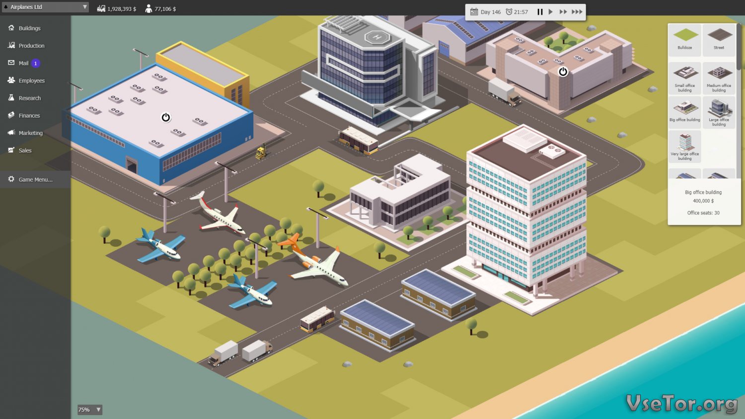 Помимо всего прочего вам придется заниматься еще и строительством зданий, производственных мощностей, и как такового небольшого промышленного городка. Например, занявшись авиастроением, вы должны будете открыть завод, потом склады, различные дополнительные фабрики и много другое. Хотя есть и другой вариант – вы всегда сможете покупать готовые детали у других производителей и собирать из них самолеты. Вариантов много, и только вам решать, по какому пути пойти… У нас вы можете скачать Business Magnate торрент последнюю версию бесплатно на компьютер.