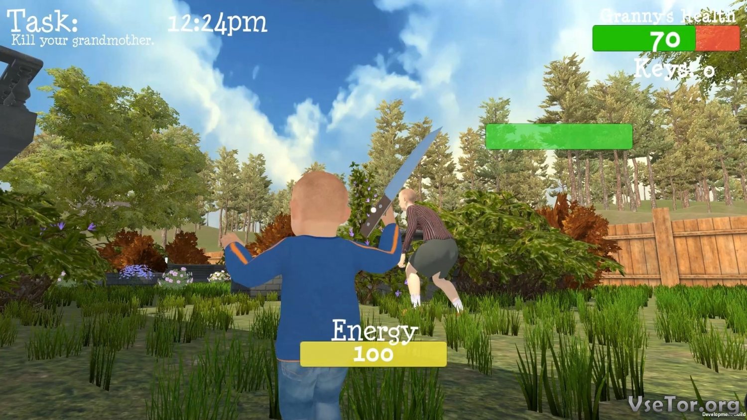 Внук же должен мешать бабуле, и в этом деле хороши все методы. Вы можете пинать в нее большие предметы, швырять ножи и стаканы, прыгать на нее сверху и делать многое другое. И весь этот процесс сопровождается отличной веселой музыкой и безумной беготней по дому. Но к слову, бабуля тоже не безобидна – она может пнуть внучка, вышвырнуть его из дома, и даже схватить, чтоб запустить куда подальше от себя. У нас вы можете скачать Granny Simulator торрент последнюю версию бесплатно на компьютер.