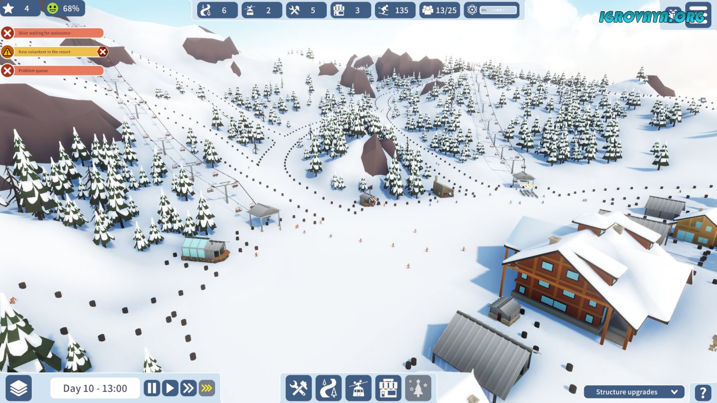 Как такового сюжета в этой игре нет. Есть лишь суть, заключающаяся в создании полноценного горнолыжного курорта. Но не думайте, что будет легко – создание такого места, это нелегкий труд, в основе которого лежит множество разнообразных процессов, задач, целей и не только. В общем, что-что, а скучать тут вам точно не придется…
