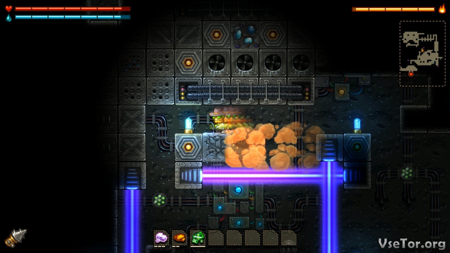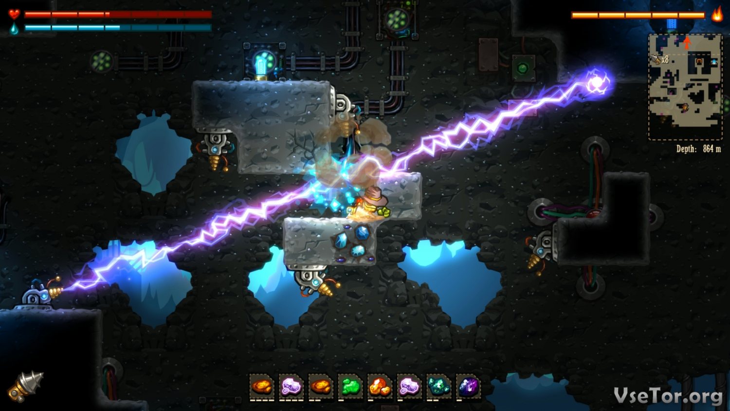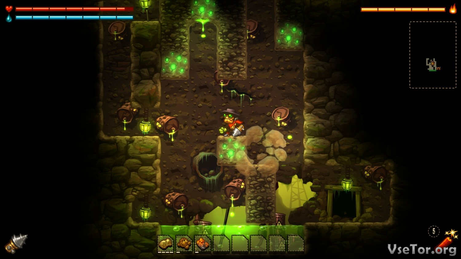 Что до игрового процесса, так он в Steamworld Dig уникален по всем направлениям без исключения. Ну а начать стоило бы с упоминания о том, что в этой игре сам геймплей основан в первую очередь на компании и сборе ресурсов. Спускаясь под землю, вы будете рыть, копать, строить тоннели, и собирать ресурсы, которые позже можно будет превратить в деньги. Но не думайте, что будет легко. Во-первых, вы то и дело будете натыкаться на различные ловушки, некоторые из которых могут спровоцировать даже гибель героя. Во-вторых, под землей велик риск попасть под обвал. Ну а в-третьих, вы то и дело будете натыкаться на различных врагов…