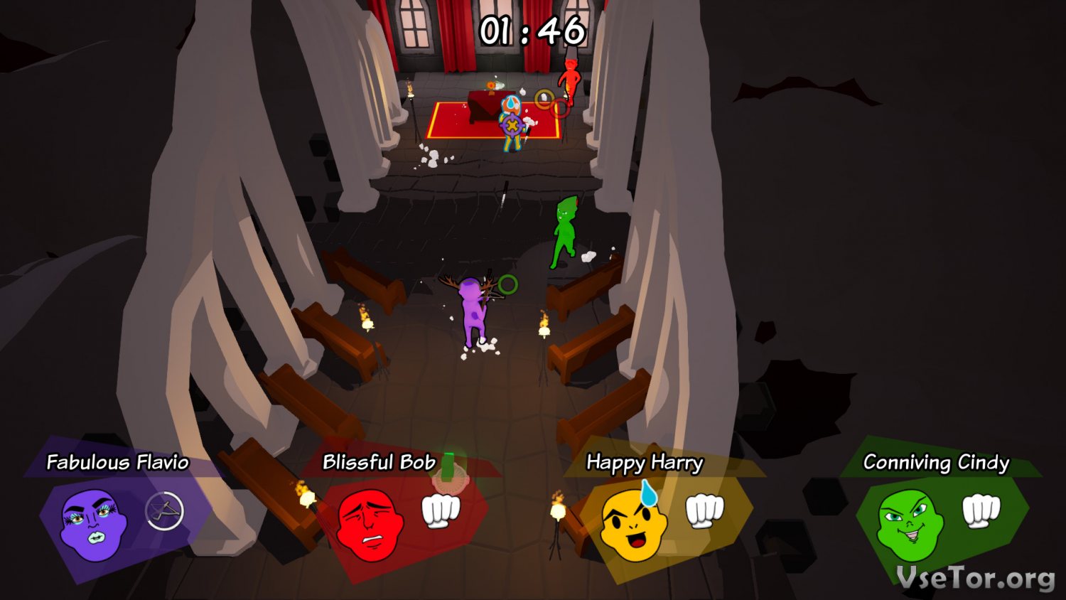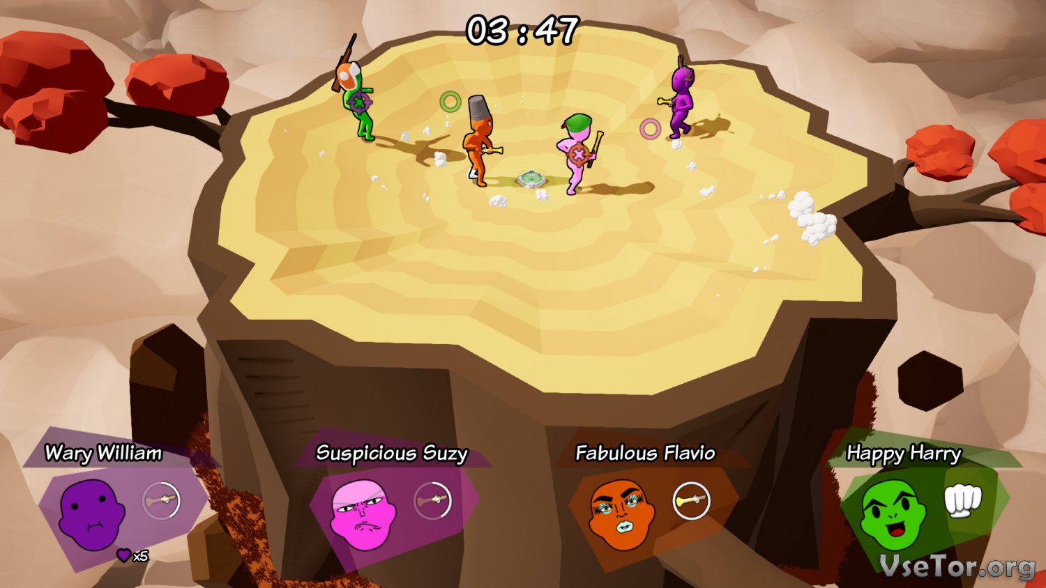 Что до вооружений, так они появляются на аренах рандомно, и брать их может каждый игрок, участвующий в битве. Причем, появиться может самое разное оружие – это может быть скорострельный автомат, бумеранг, возвращающийся после удара врага обратно, огненный молот, рогатка, или и вовсе магических посох. Причем, все оружие появляется в одном экземпляре – кто первый подобрал, то им и дерется, но после убийства врага вы всегда сможете подобрать его оружие. А еще здесь можно расставлять смертоносные капканы и ловушки… У нас вы можете скачать Kerfuffight торрент последнюю версию бесплатно на компьютер.
