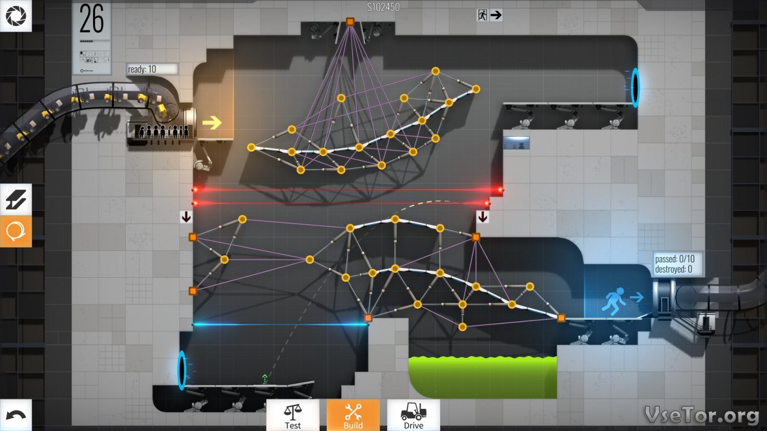 Главная особенность Bridge Constructor Portal заключается в том, что на уровнях вам придется не просто строить мосты через пропасти и ловушки, но еще и использовать силу тяжести, гравитацию, физику и специальные порталы, через которые подопечные смогут телепортироваться в разные уголки уровней.