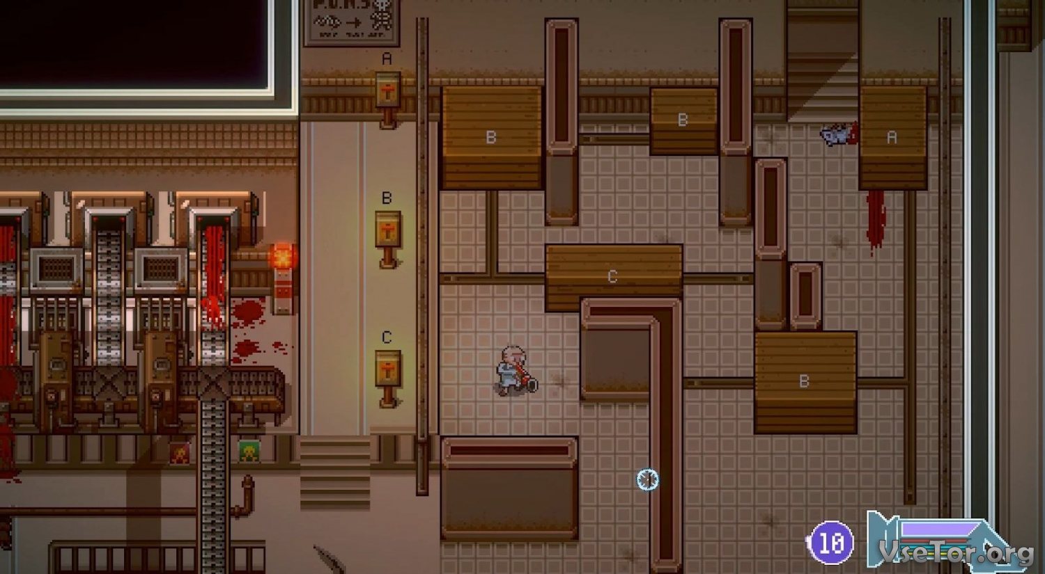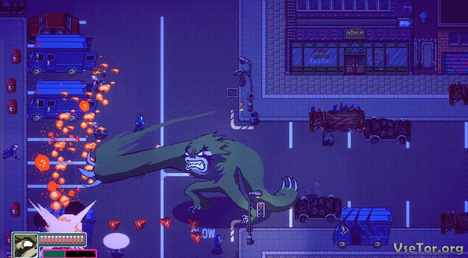 В целом же игровой процесс в Shadow Of The Sloth довольно прост и базируется на самых простых механиках. С видом сверху вы будете бегать по городу, уничтожать врагов, выполнять несложные задания, прокачиваться, и собирать коллекционные предметы. Ничего сложного, но при этом игра буквально очаровывает, и в первую очередь, той атмосферой, которая в ней царит во время беготни по городу. Взрывающиеся тачки, полицейские, в ужасе начинающие палить во все стороны, кровь, боссы – все это создает ощущение безысходности вперемешку с безумием.