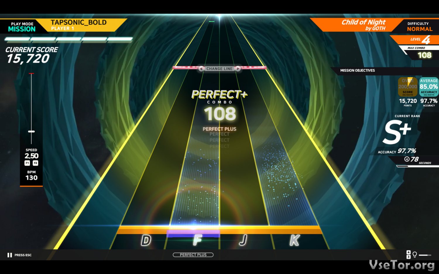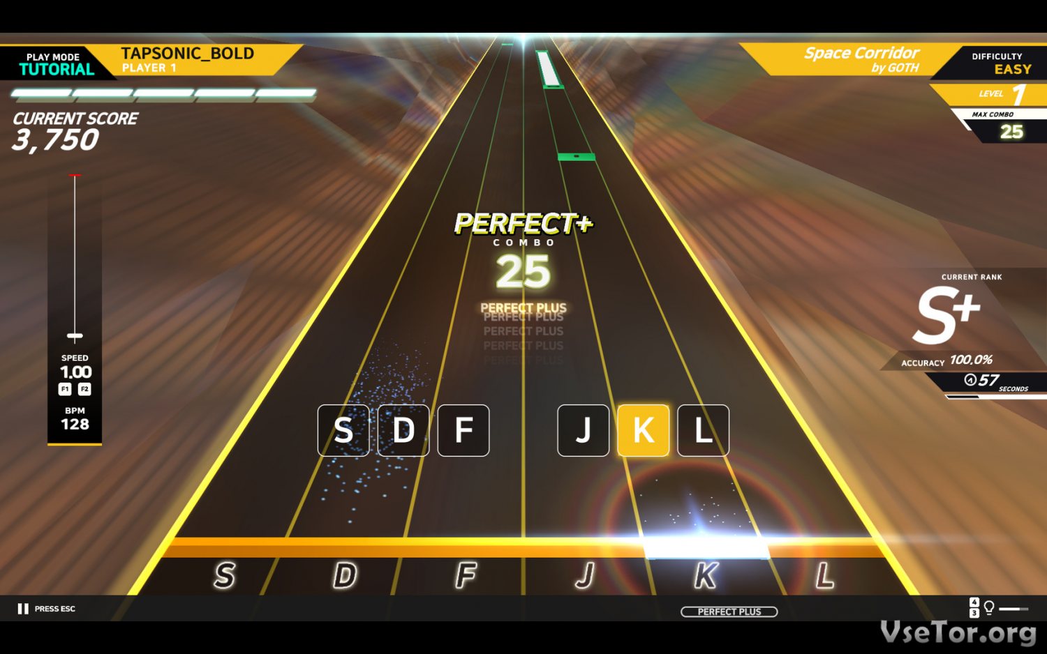 Но на самом деле игра кажется простой только в самом начале, когда музыка еще не так интенсивна и быстра, и когда ритмы появляются на горизонте с маленькой скоростью. Но вся суть в том, что, чем больше вы правильно нажимаете на кнопки, тем быстрее становится треки, и тем сложнее в итоге улавливать ритмы. Уже через некоторое время TAPSONIC BOLD удивит вам более быстрыми треками, более ритмичными и интенсивными мелодиями, и не только…