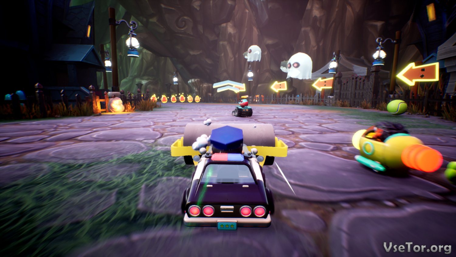 Отдельно же стоило бы сказать о бонусах. На каждой трассе вы найдете многочисленные яйца с сюрпризами, которые вам нужно будет подбирать. В каждом из них вас будет ждать какой-нибудь бонус, который вы сможете использовать себе во благо, например, против соперников, или же для улучшения собственных характеристик. Это может быть «бургер-щит», липкая слизь, которую можно разлить на трассе, чтоб она замедляла соперников, или же и вовсе что-нибудь такое, что ускорит вас. Вариантов много, и каждый бонус по-своему уникален.