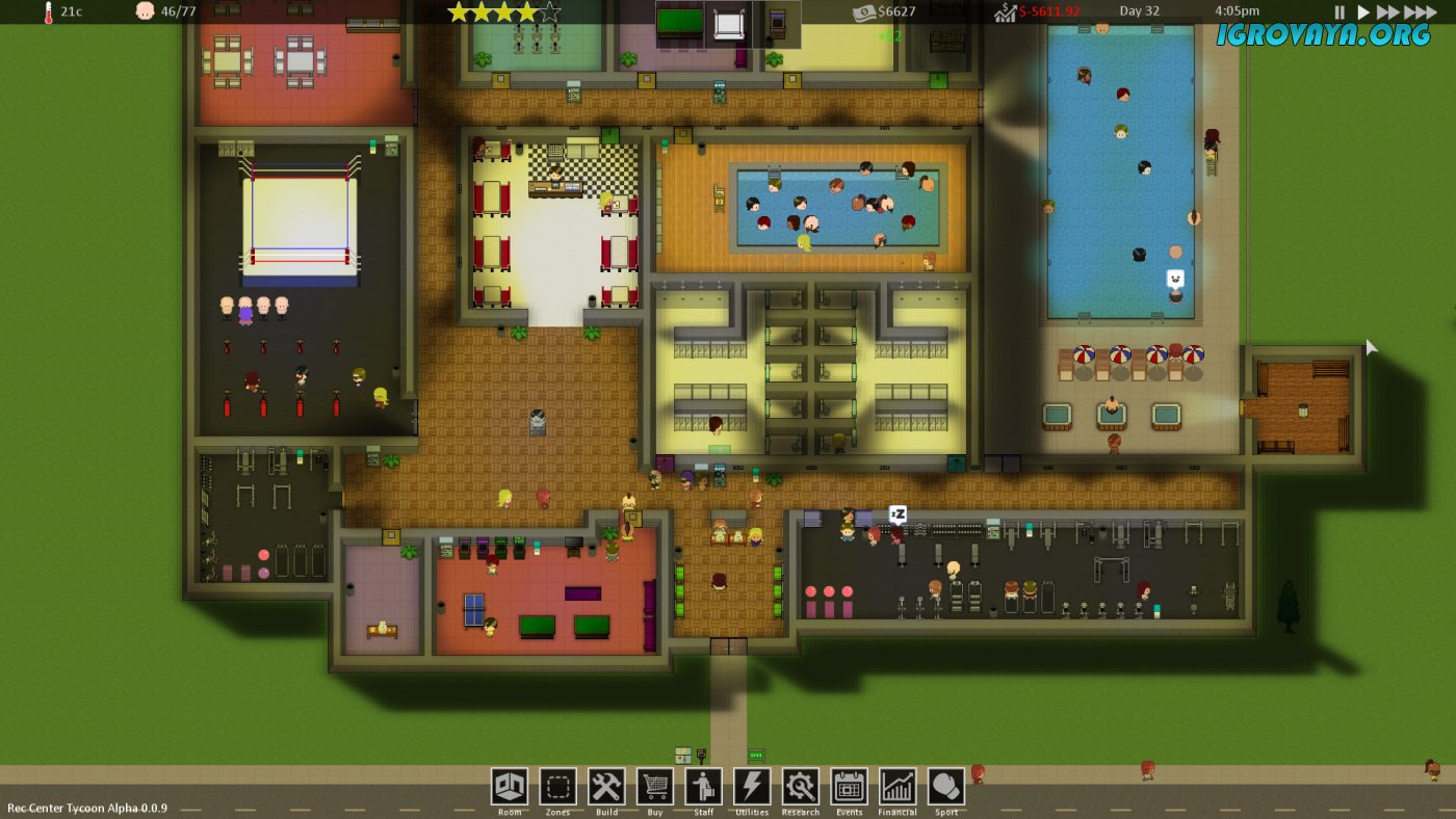 Начинать же вы будете в Rec Center Tycoon, как и в любом другом менеджмент-симуляторе тоже с нуля. Вам придется взять территорию под застрой и начать на ней строить свой собственный центр. Сначала в вашем распоряжении будет лишь незначительная сумма денег, но уже через некоторое время вы сможете заработать денег и построить что-нибудь невероятное. Ну а пока что придется довольствоваться тем. что есть. Постройте небольшое помещение и поделите его на комнаты, наймите персонал, оборудуйте помещения так, как вам нужно, и начните заселять первых клиентов.