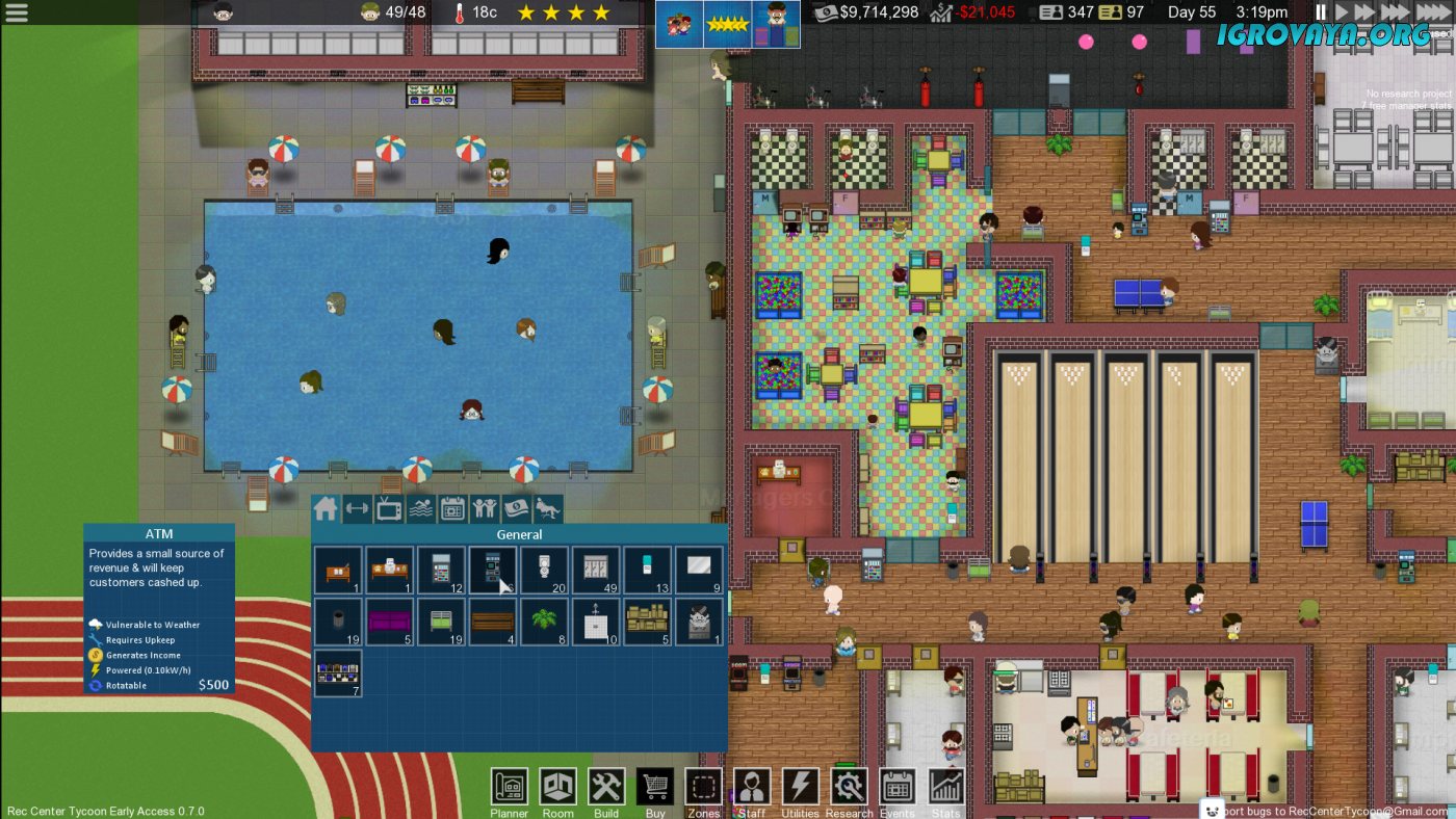Rec Center Tycoon – это масштабная песочница и одновременно симулятор менеджмента, игра, в которой вам придется управлять самым настоящим центром отдыха, в который будут съезжаться клиенты со всего мира…
