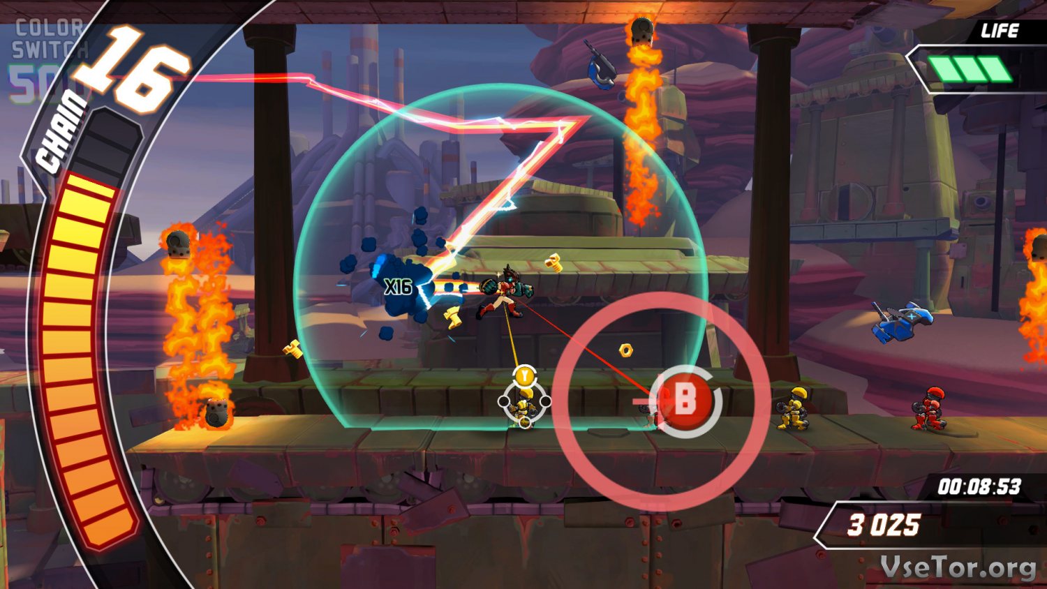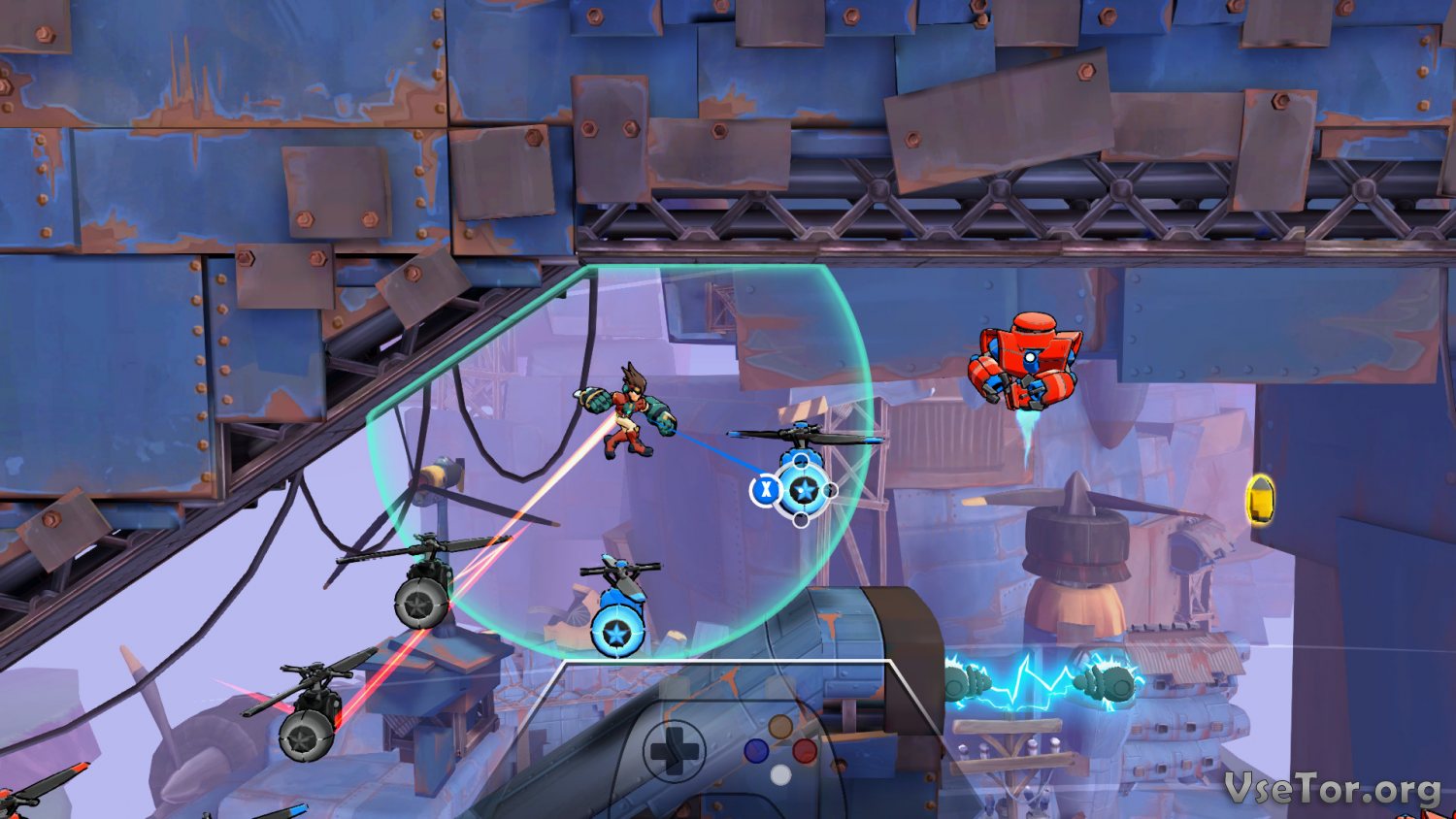 Прыгайте по разноцветным платформам, ориентируясь на их цвет, цепляйтесь за выступы и выстреливайте собою вверх, используя руки-молоты, сражайтесь с разнообразными роботами, проходите уровни и испытывайте себя в забегах на скорость, и самое главное, постарайтесь одержать верх над захватившими планету роботами. У нас вы можете скачать Skybolt Zack торрент последнюю версию бесплатно на компьютер.
