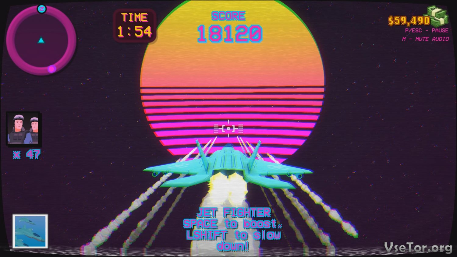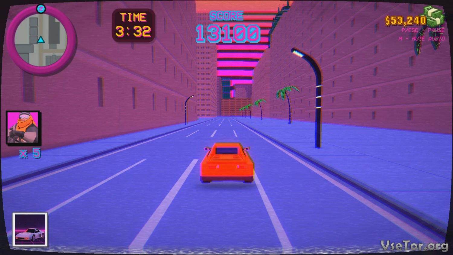И первым делом стоило бы сказать о том, что эта игра, а точнее все окружение в игре, выполнено в ретро стилистике. Фиолетовые цвета оформления, мультяшная ретро-графика, синтезаторная музыка и лампы, переполняющие все окружение неоном – все это создает безумную, но при этом прекрасную атмосферу.