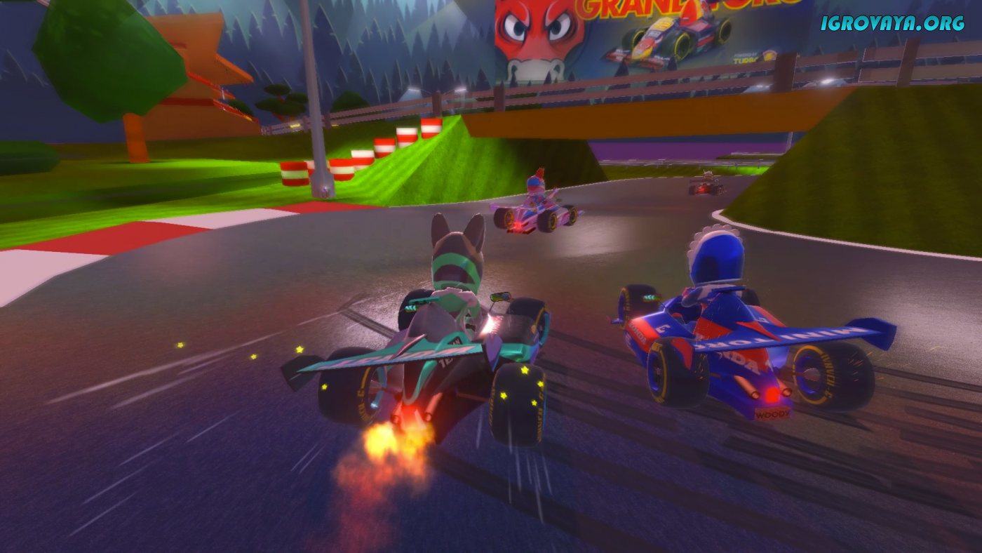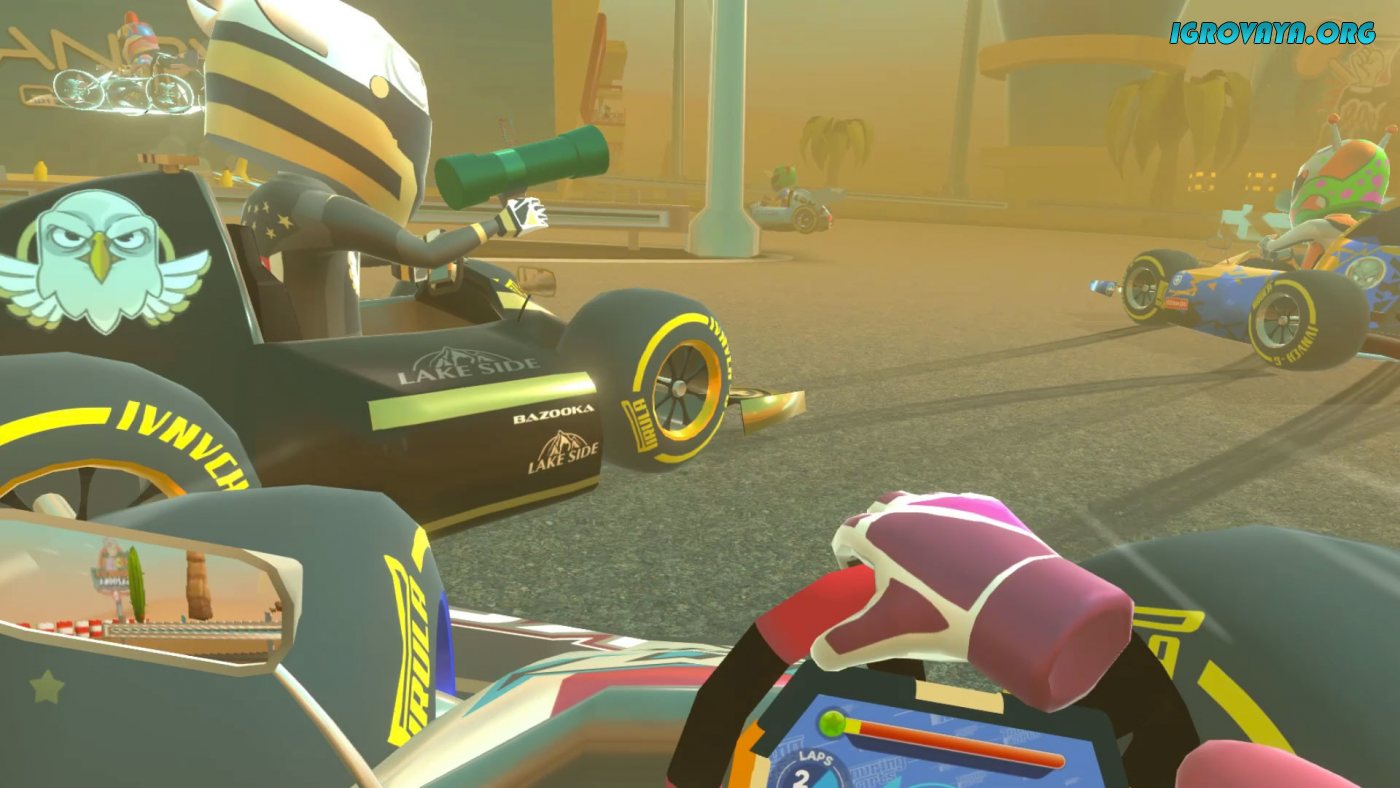 В целом же игровой процесс описать легче простого. Он базируется на традиционных для жанра механиках. То есть, вы будете участвовать в заездах с разными противниками, пытаться одолеть их на трассе и приехать к финишу первым, а попутно будете еще и мешать противникам, используя всевозможные примочки, что будут попадаться во время заезда. Примочки же могут быть самыми разными, от деревянной кувалды, до разных ловушек и всего прочего.