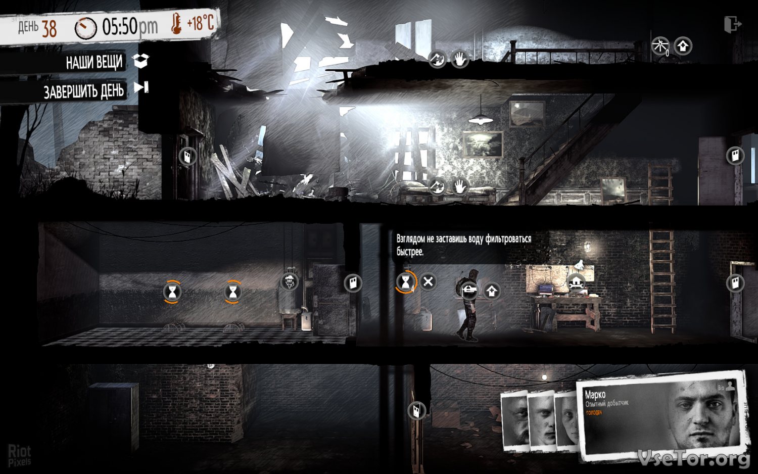 Мораль? Совесть? Забудьте об этих понятиях! В этой игре не важны мораль и человеческие качества, здесь ваша главная задача – выжить и продержаться как можно дольше. Исследуйте мир, устраивайте вылазки, отправляйте за провизией своих гостей и выживайте… У нас вы можете скачать This War of Mine торрент последнюю версию бесплатно на компьютер.