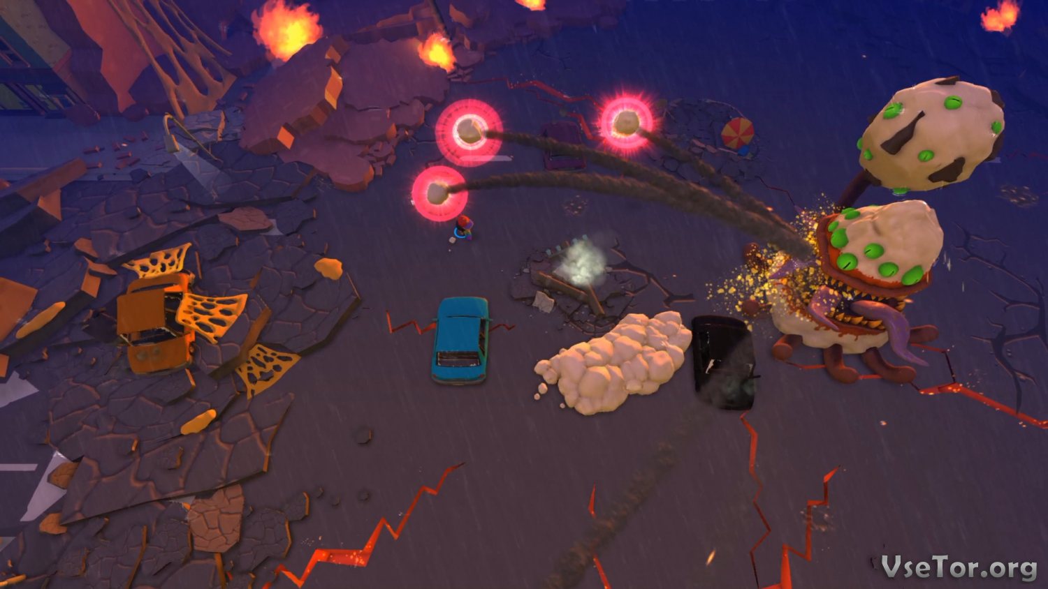 Nom Nom Apocalypse – это приключенческой хоррор-шутер с видом сверху, выполненный в стиле «roguelite». Здесь вам придется сражаться на просторах апокалиптического мира с ожившими хищными продуктами, выполнять задания, выживать, отбивать город и спасать людей…