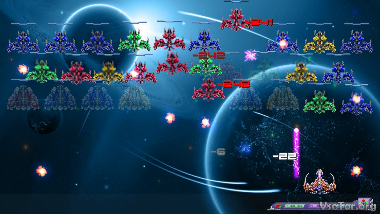Игровой процесс тут не так уж и сложен в плане освоения и предлагает лишь проверенные временем классические механики и процессы. Вы будете появляться на аренных локациях и там должны будете сражаться с врагами, которых всегда будет в десятки раз больше. Вам будут противостоять десятки космических истребителей, и каждый будет пытаться убить вас. Ну а вам же нужно лишь убивать их в ответ, стрелять по всему, что движется, уклоняться от атак и летящих в вас снарядов, и выживать.