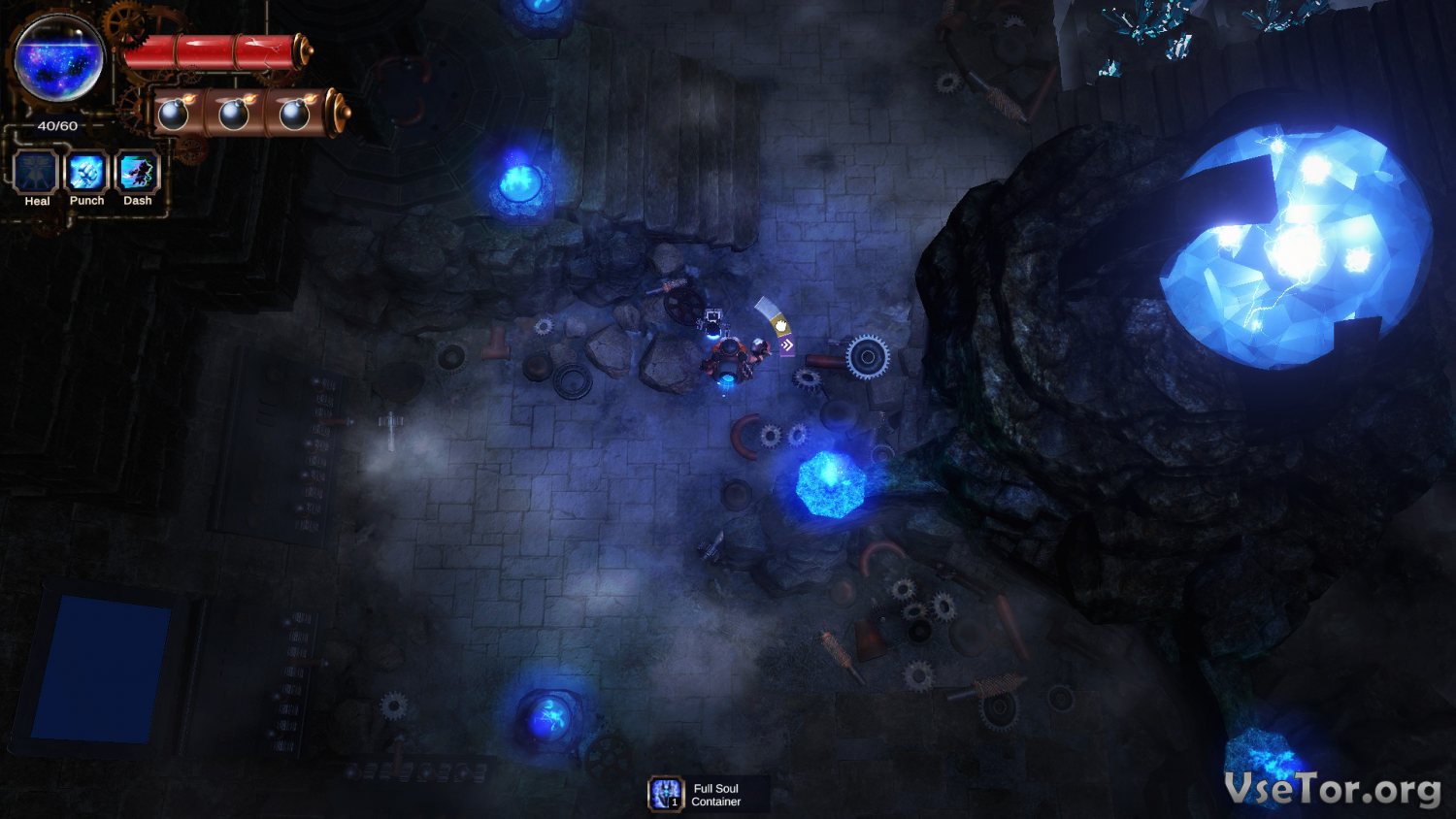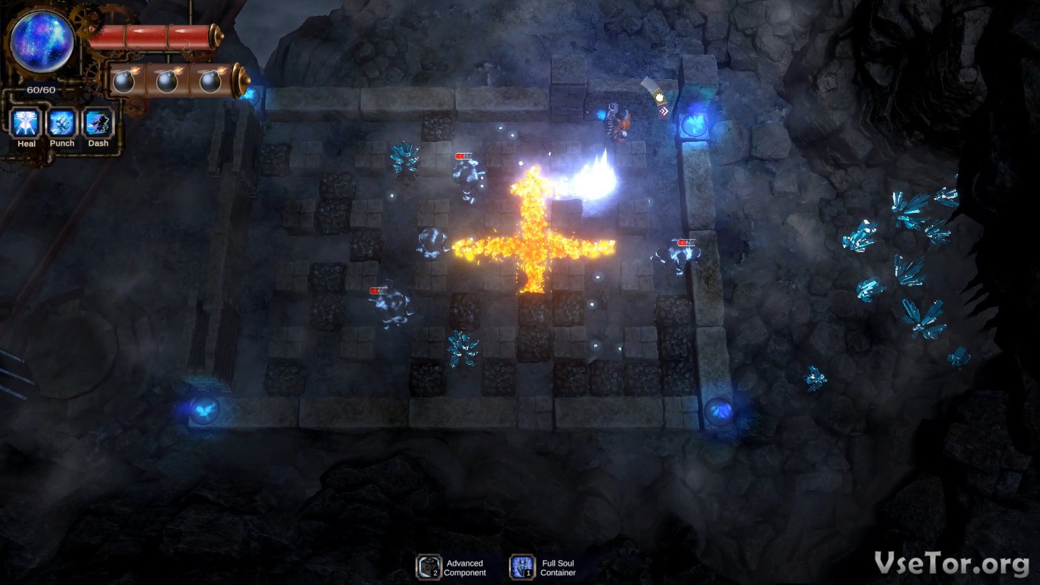 Игровой же процесс тут основывается на механиках, что использовались в «Bomberman». Ваш костюм вырабатывает бомбы, которые вы сможете использовать против врагов. Никакого другого оружия у вас нет, но поверьте, оно вам и не потребуется. Вы будете проходить уровни и сражаться с монстрами, таящимися в глубинах странных храмов, будет получать улучшения для своего костюма, прокачивать бомбы (радиус или скорость производства), и таким образом продвигаться по сюжетной линии. Ничего сложного по большому счету тут нет…