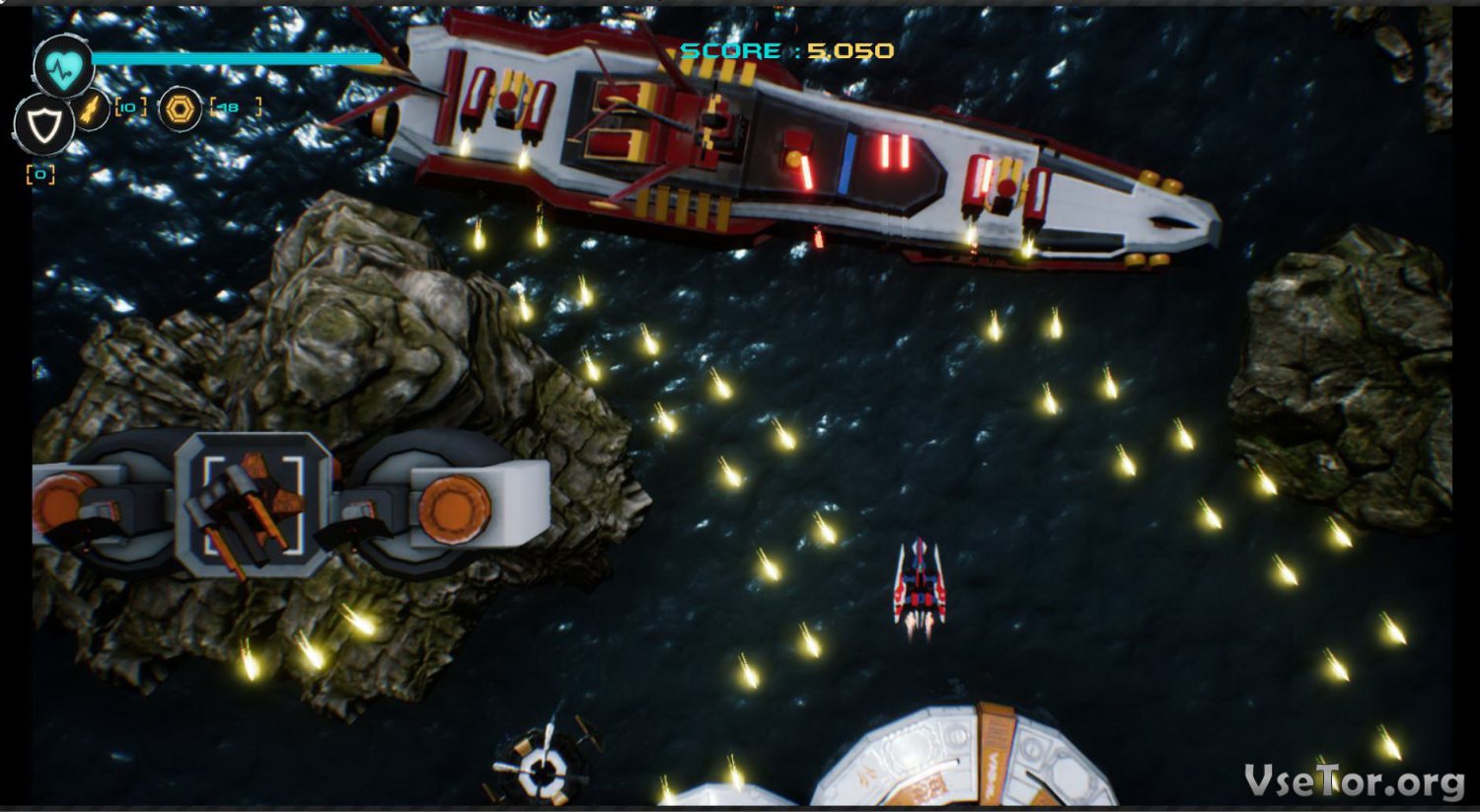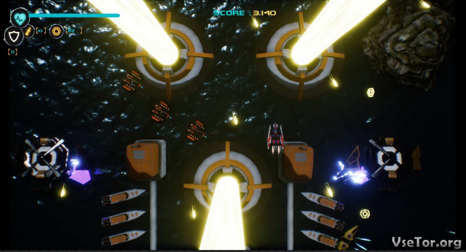 Что касается игрового процесса, так он тут придерживается классических механик жанра. В режиме вида сверху вы будете управлять космическим истребителем, проходить многочисленные уровни, мчась вперед не невероятной скорости и уничтожая всех врагов, что встречаются по дороге к цели, и биться с боссами. Вроде бы ничего принципиально нового, но при этом игра все равно восторгает, ведь предлагает очень интенсивный геймплей.
