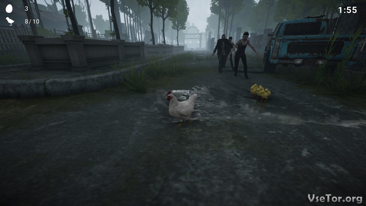 Огромный мир, кровожадные зомби, заполонившие буквально все вокруг, кровь и мертвецы, брошенные дома и тележка, на которой по этому миру путешествует курица и ее птенцы – все это создает одновременно и комичную, и трагическую атмосферу. Но это не главное. Главное то, что вам в этих условиях придется выживать всеми возможными способами. А ведь выжить, умея лишь швыряться яйцами, не так уж и просто. Не верите? Тогда вперед…